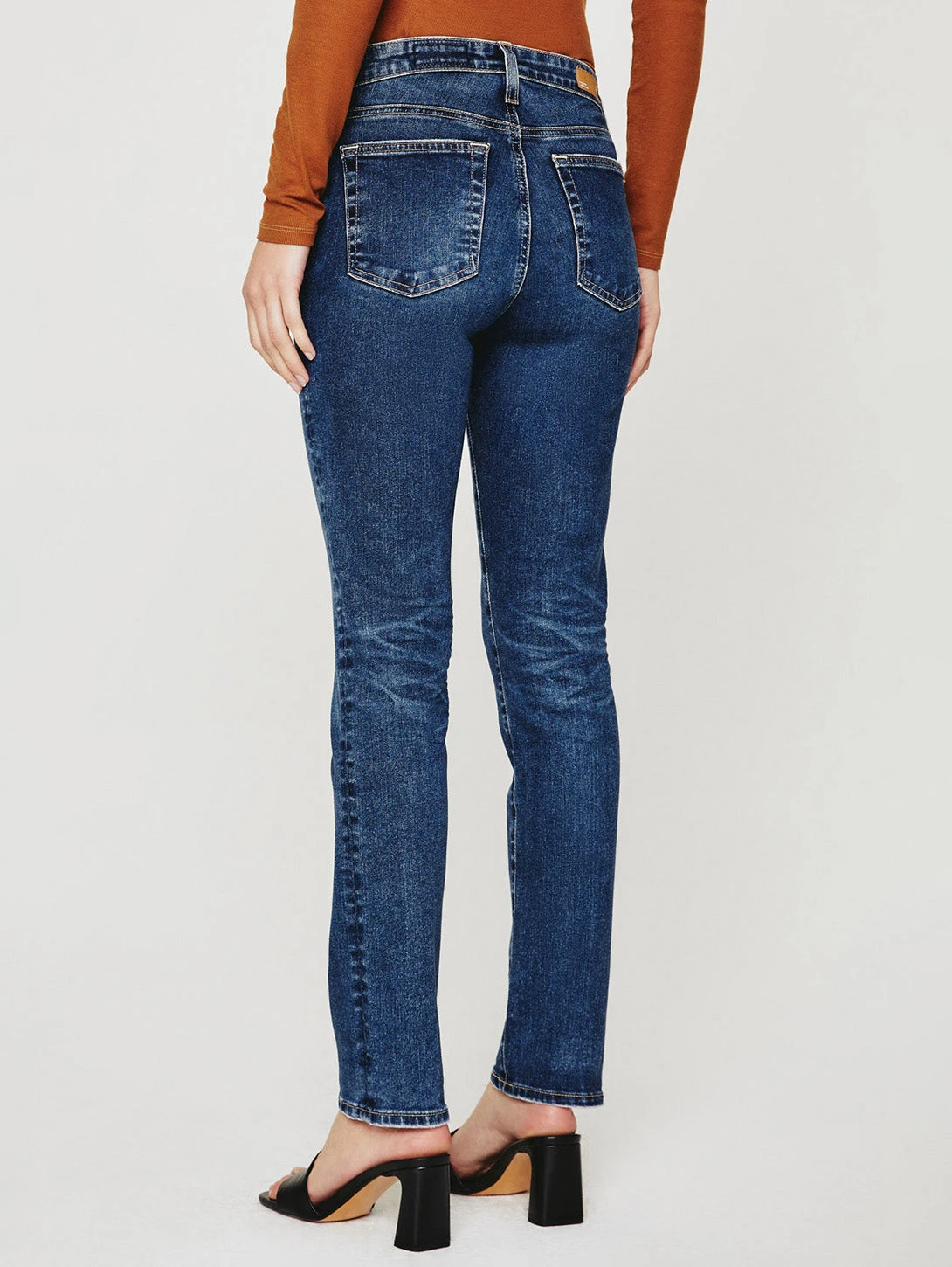 Mari is a high-rise straight-leg jean featuring an 8-year dark wash with fading, and whiskering, along the front. Offers a flattering high-rise waist and fits easily around the hips, finished with a straight leg and subtle slim leg opening.Â