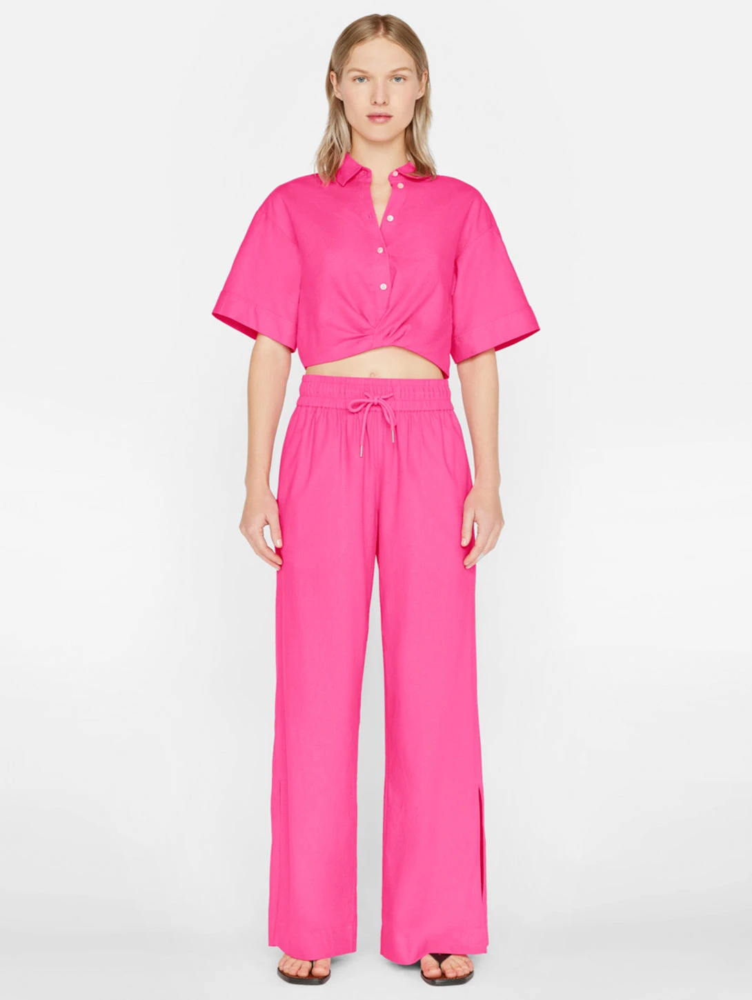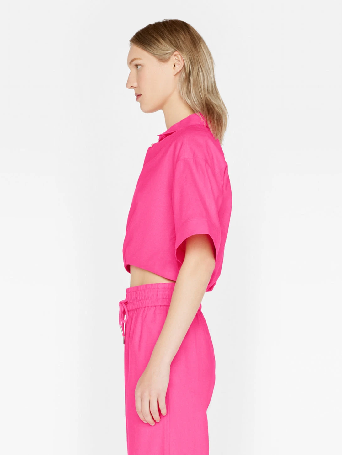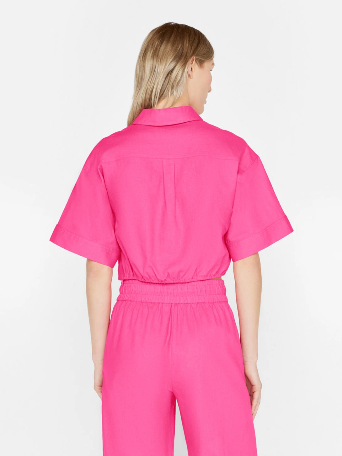 Perfectly cropped and finished with a twist detail at the front hem, this short-sleeve button-down shirt is finished with an elasticized hem for a little feminine flounce. Done in the colour of the season, Flamingo, pair yours with denim shorts for pool party perfection, or matching trousers for summer polish.