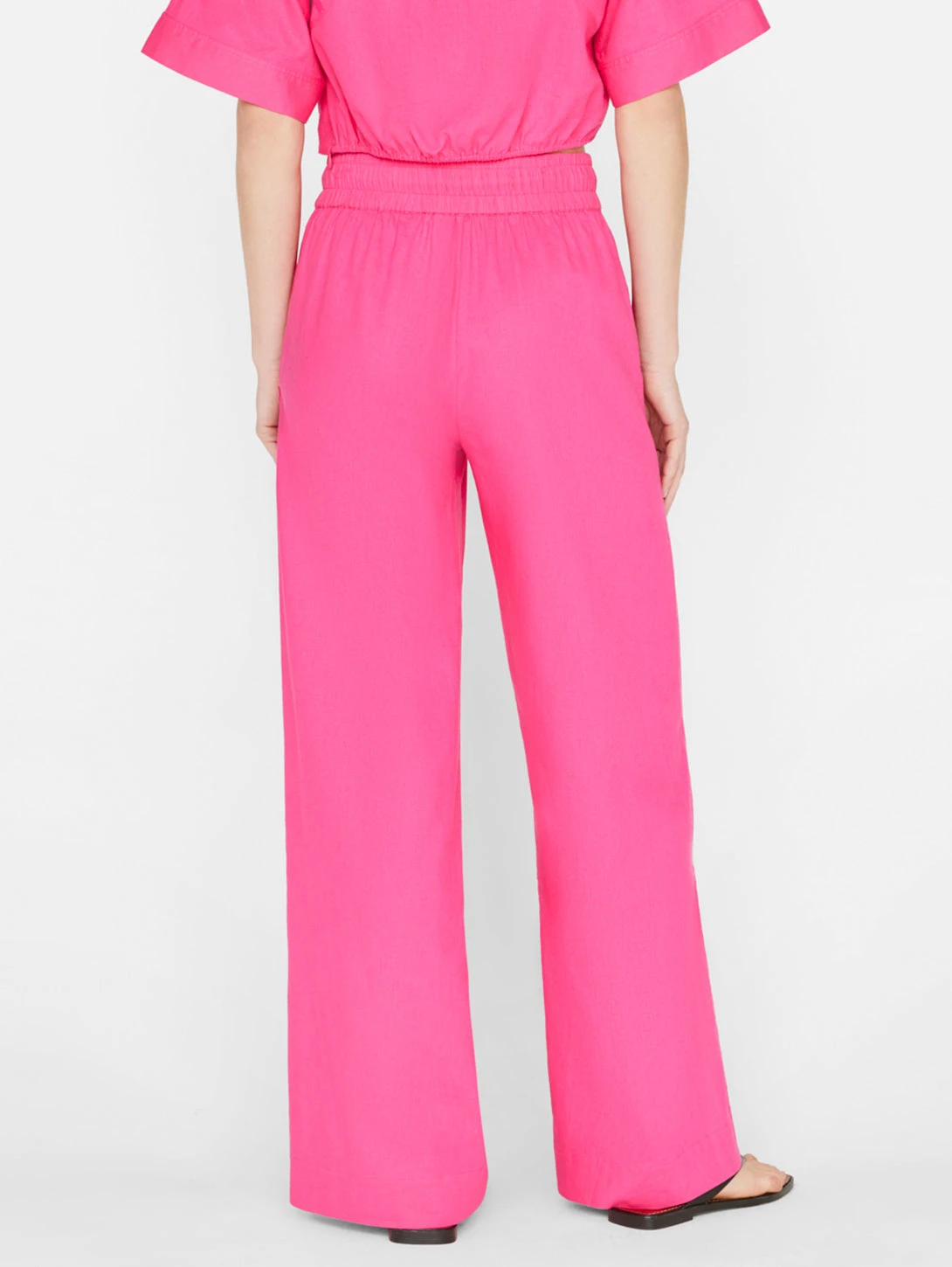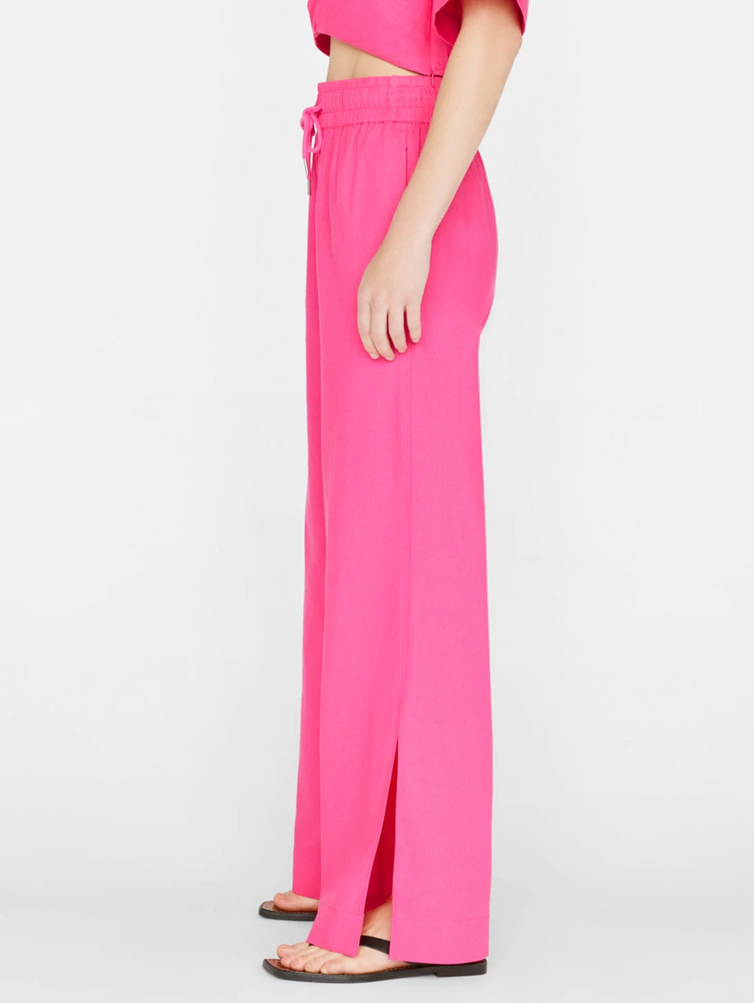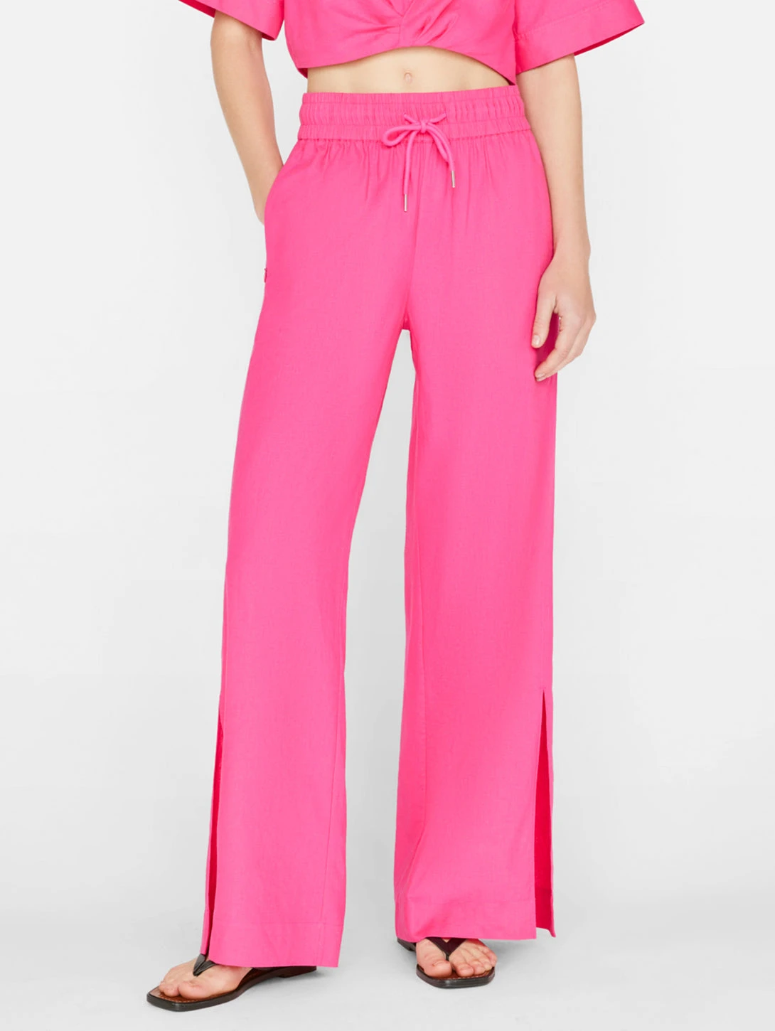 One-half of the most vibrant leisure set your carry-on has ever seen, the high slits on the breezy wide legs of these linen drawstring pants elevate them from loungewear to wear-to-the-cocktail-lounge wear. This pant features a high-rise elastic waist with drawcords, and zip pockets at each side.