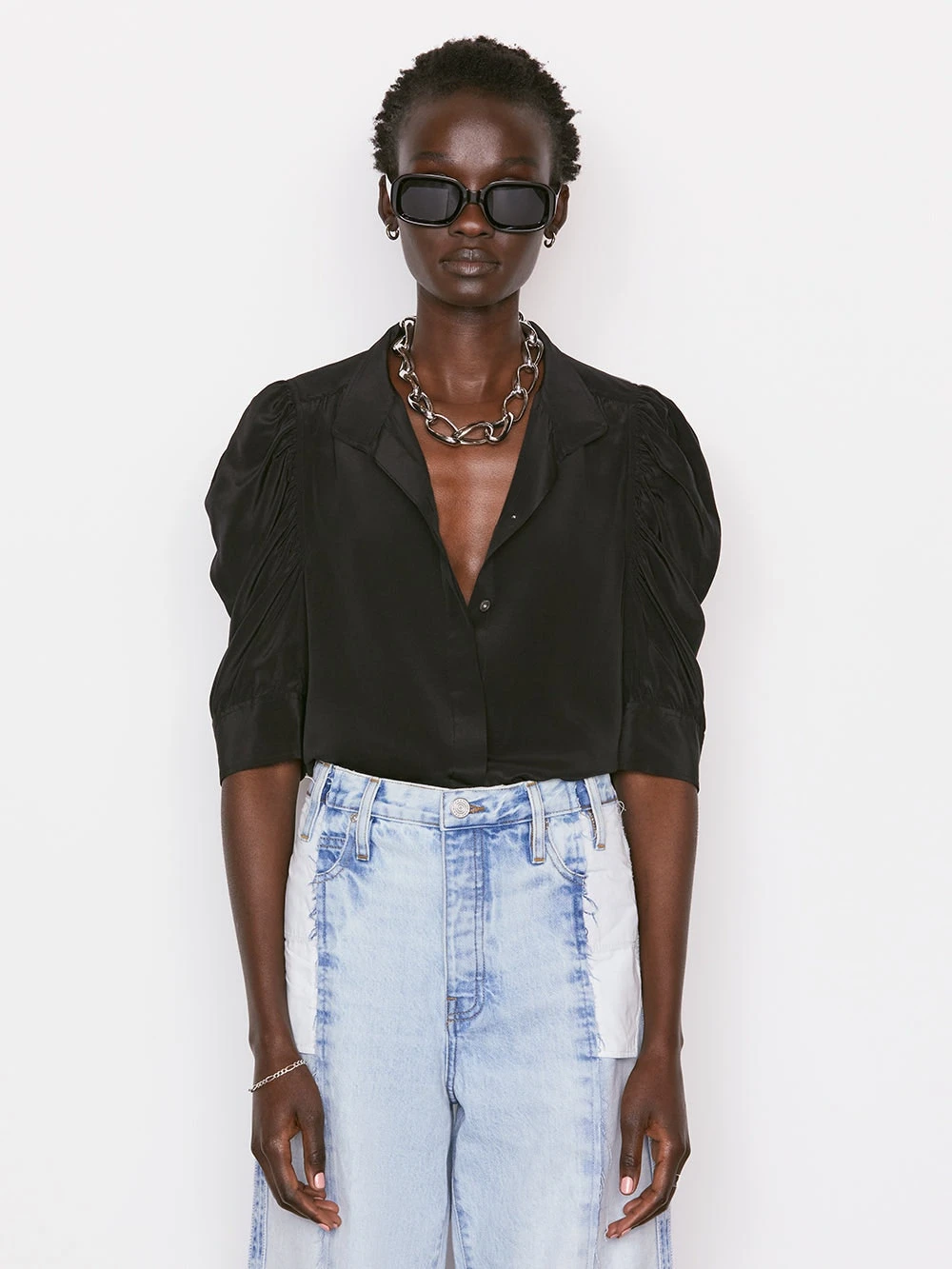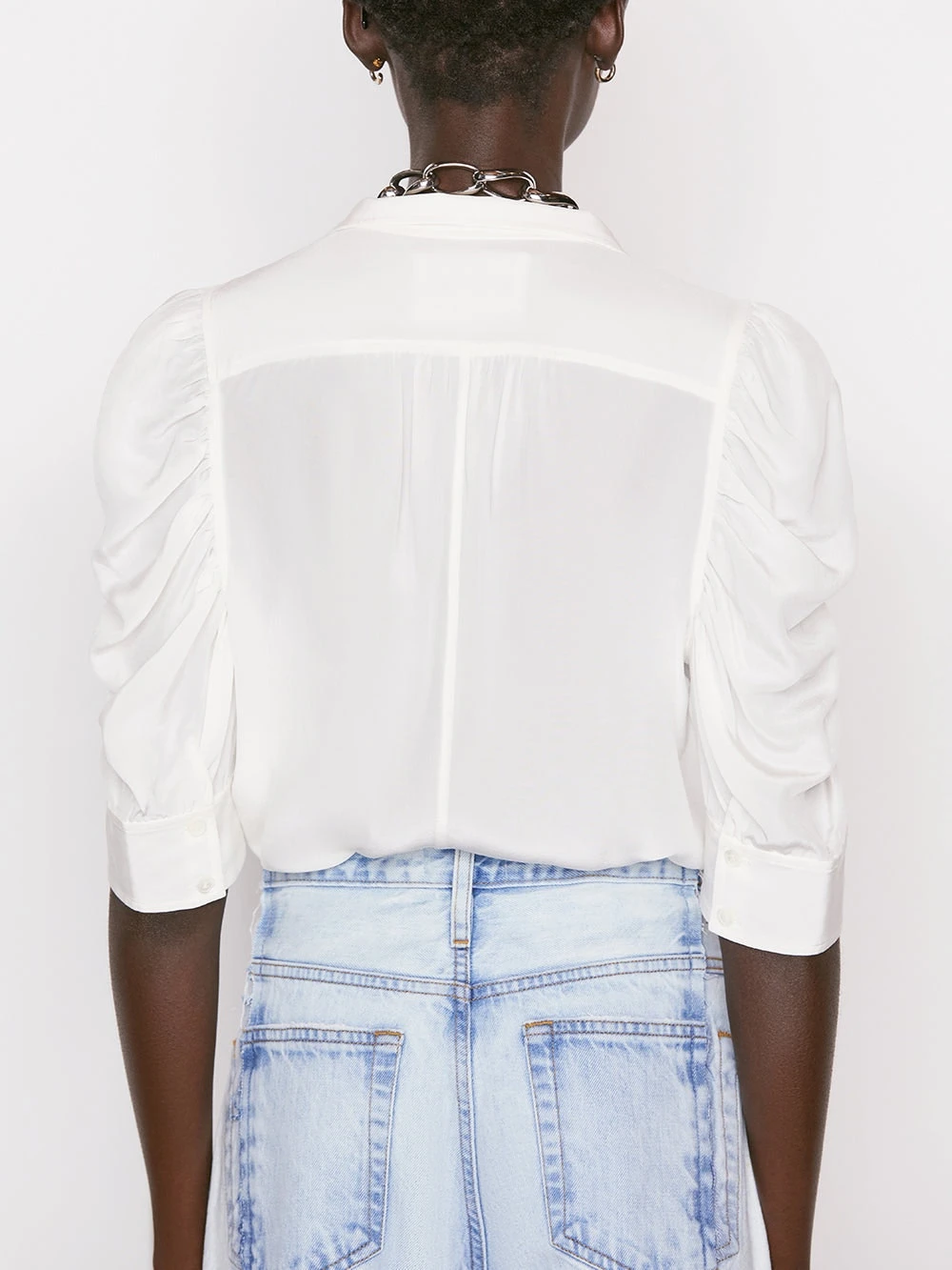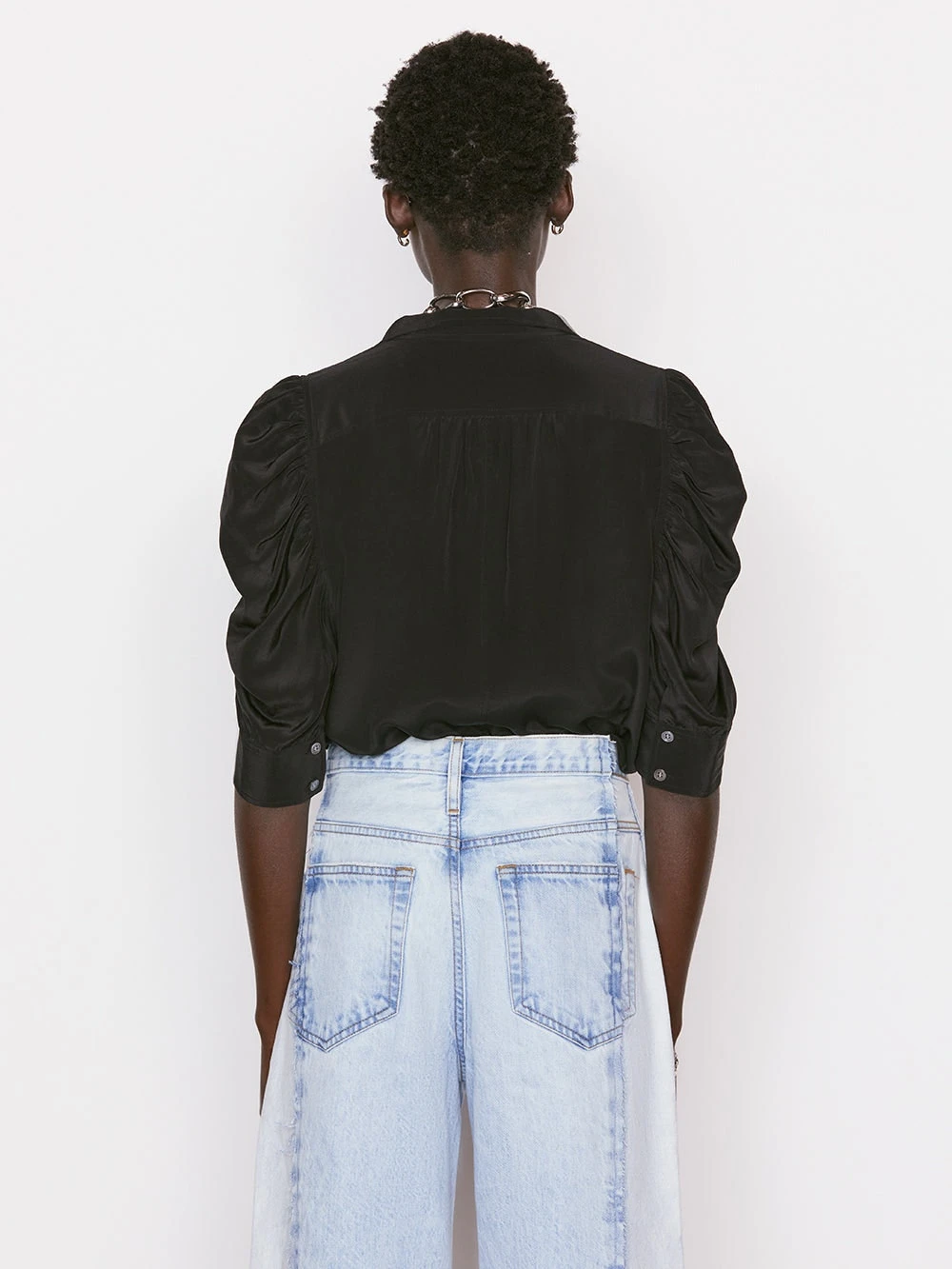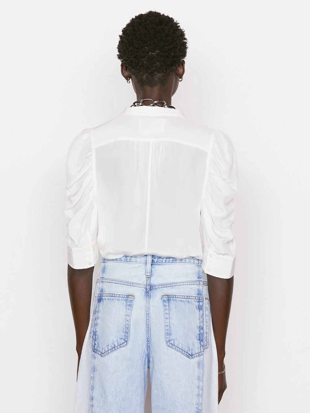 This delicate ramie blouse epitomizes modern femininity, featuring a high neckline and boldly puffed sleeves with ruched detailing. We love it tucked into cropped wide jeans with leather slides and a slim belt.Â