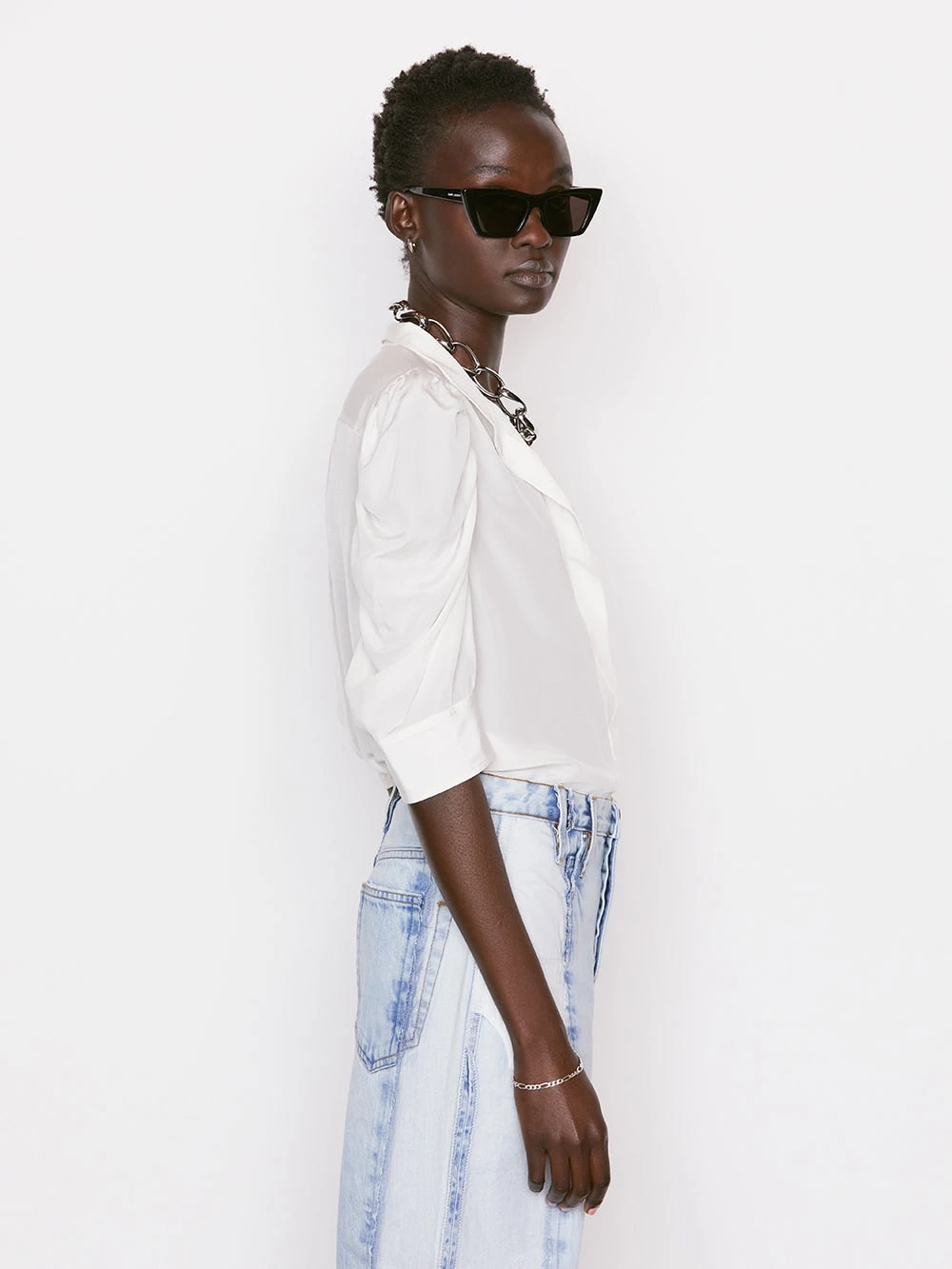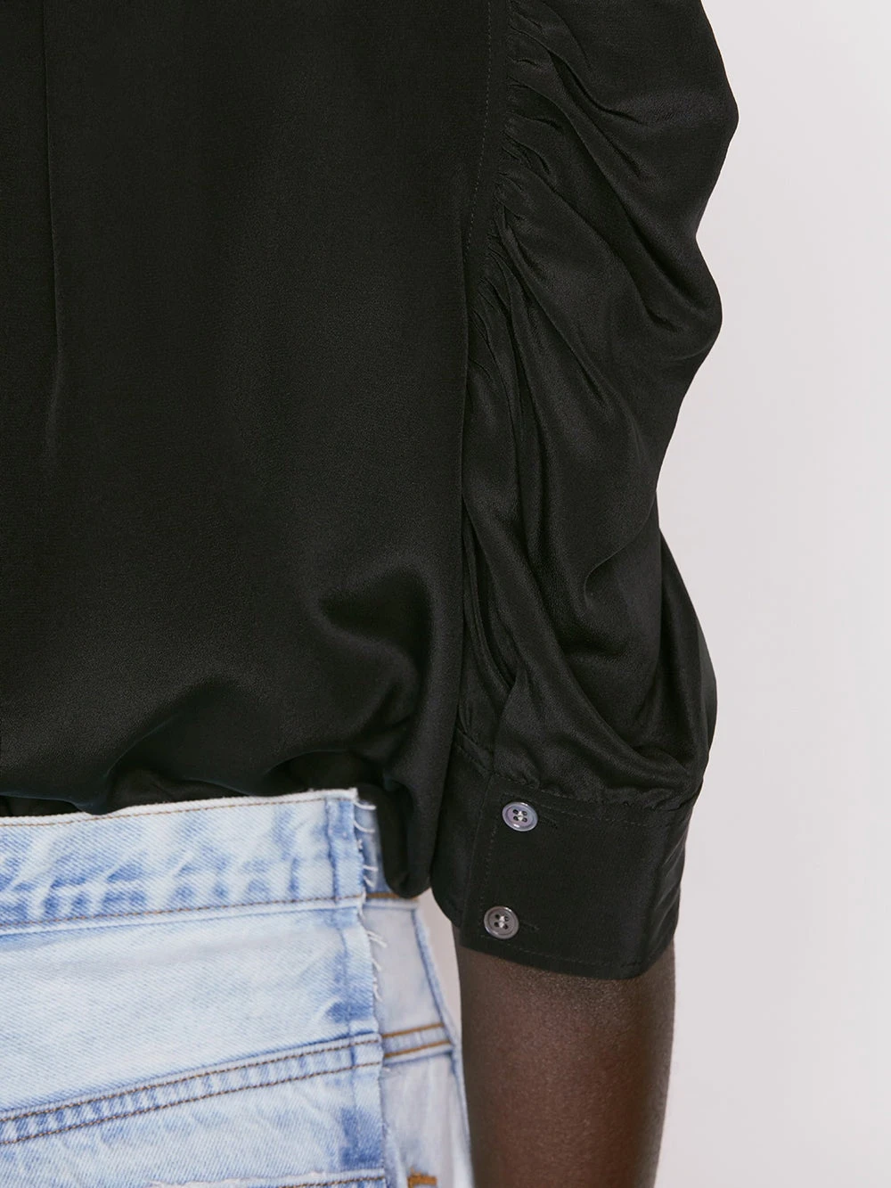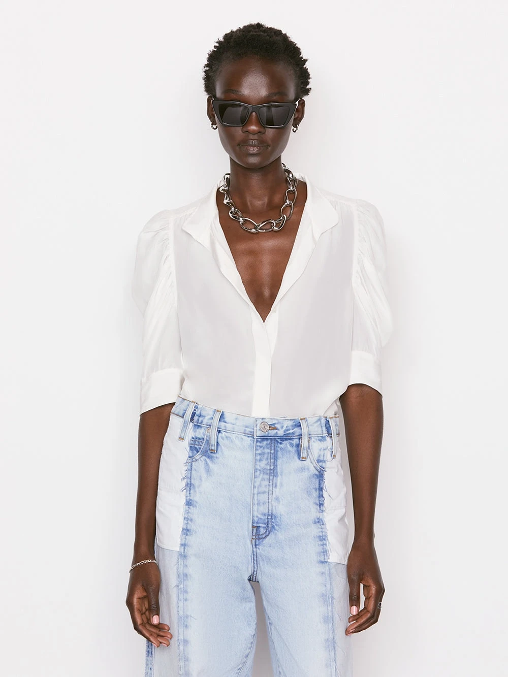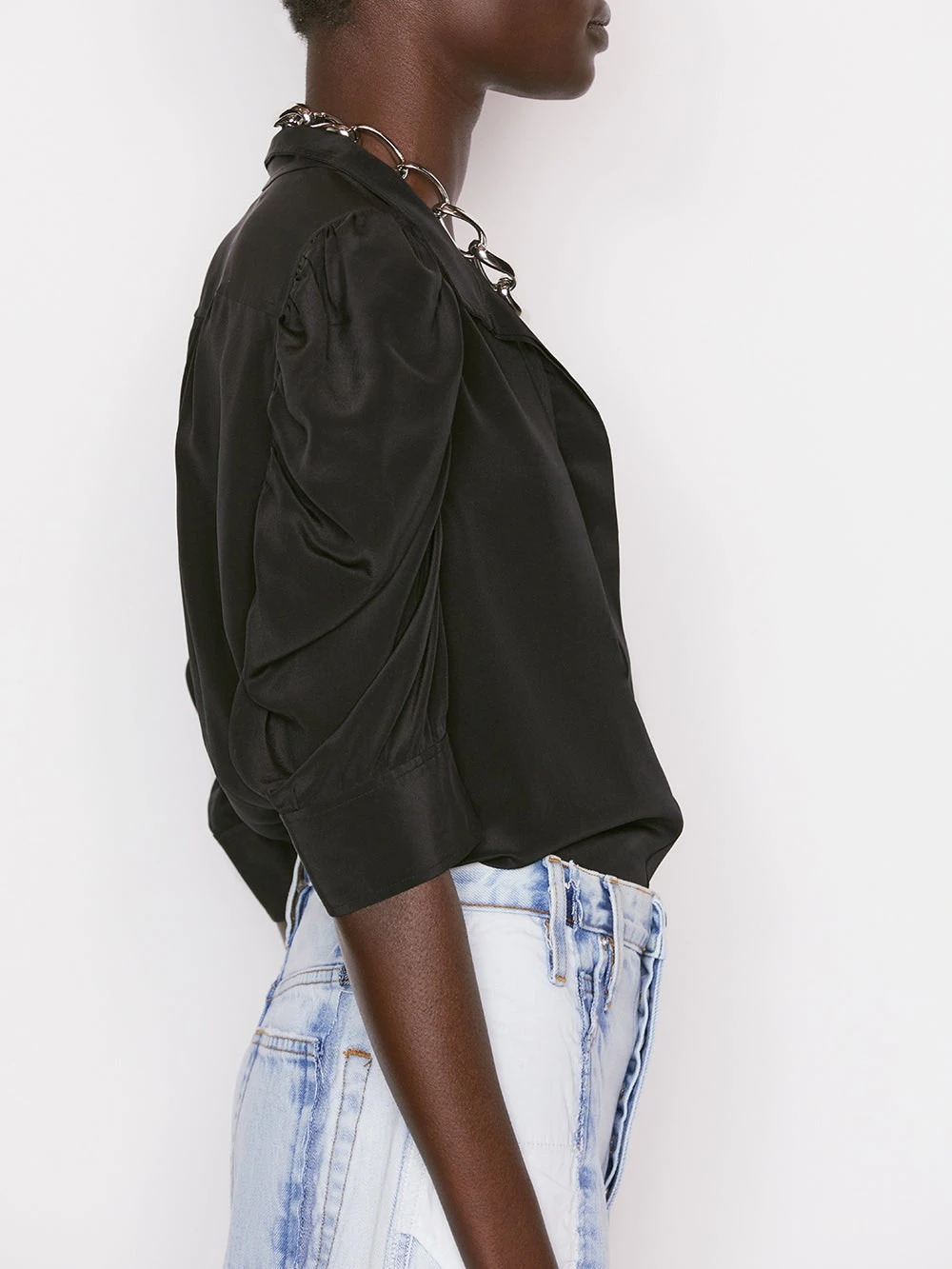This delicate ramie blouse epitomizes modern femininity, featuring a high neckline and boldly puffed sleeves with ruched detailing. We love it tucked into cropped wide jeans with leather slides and a slim belt.Â