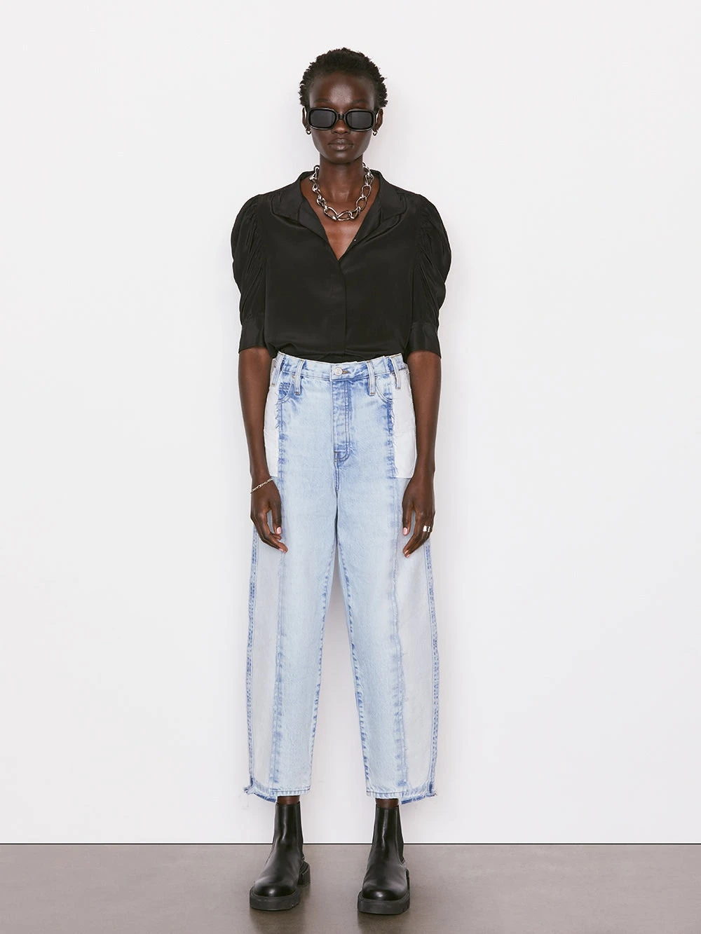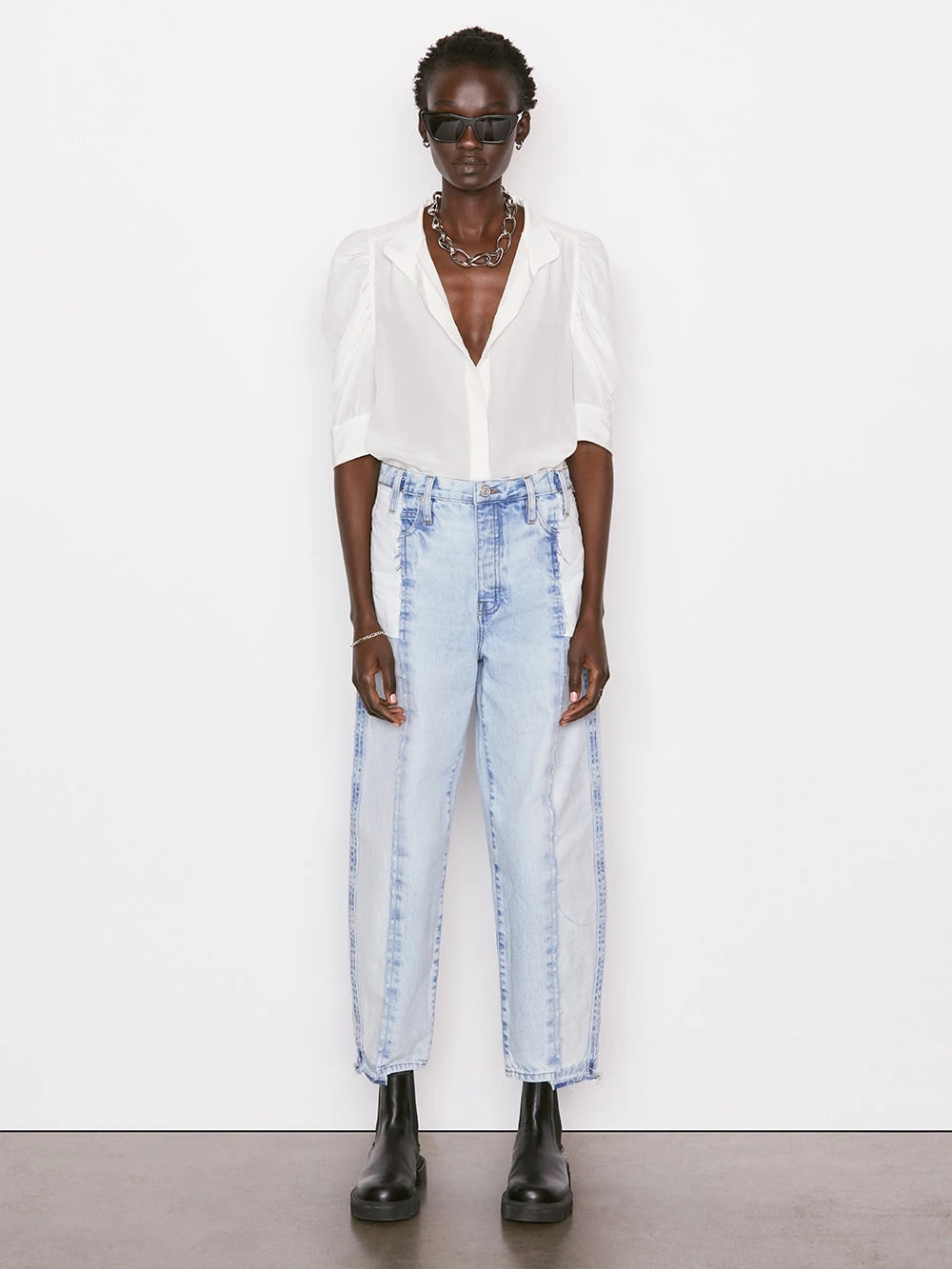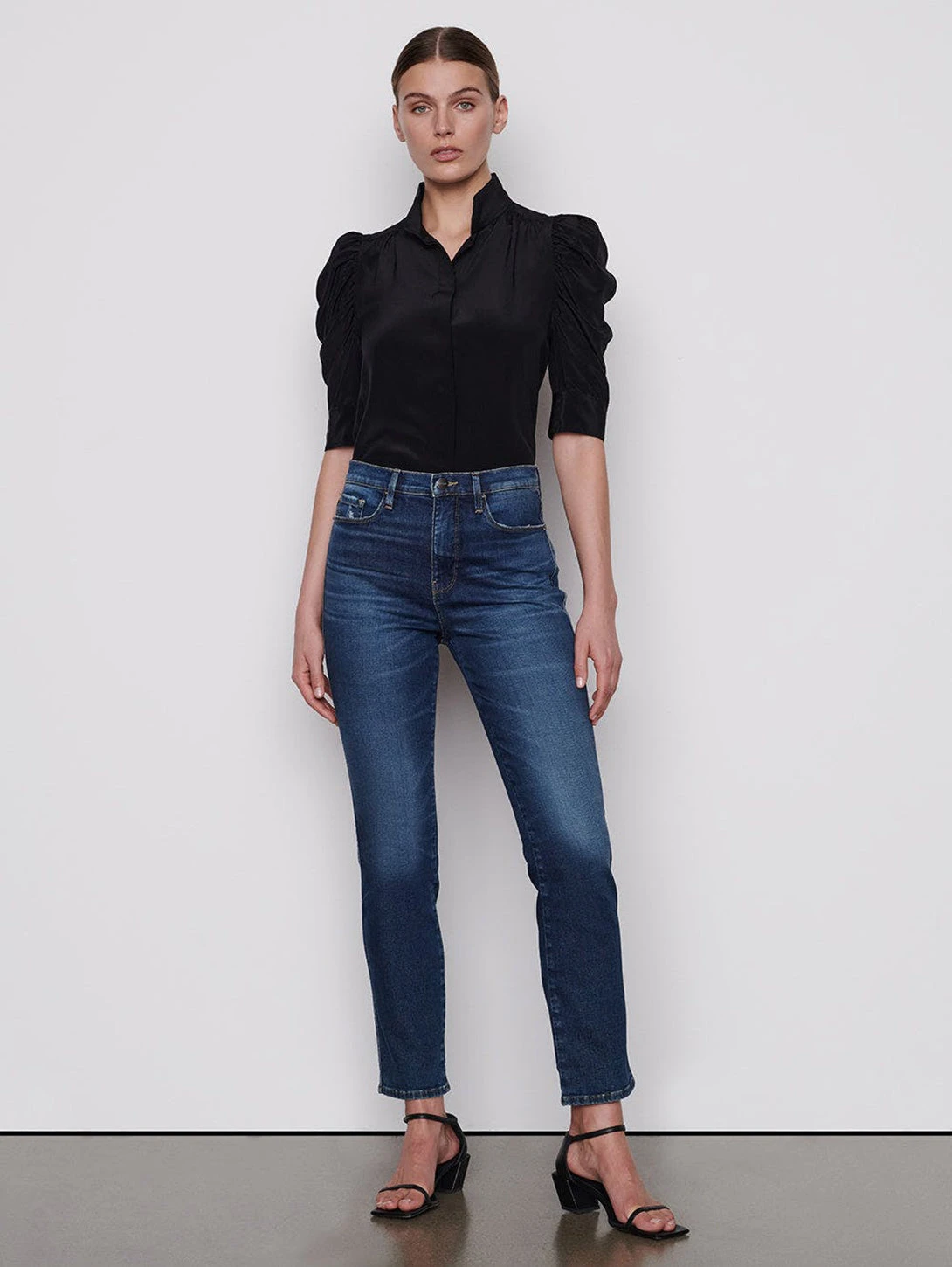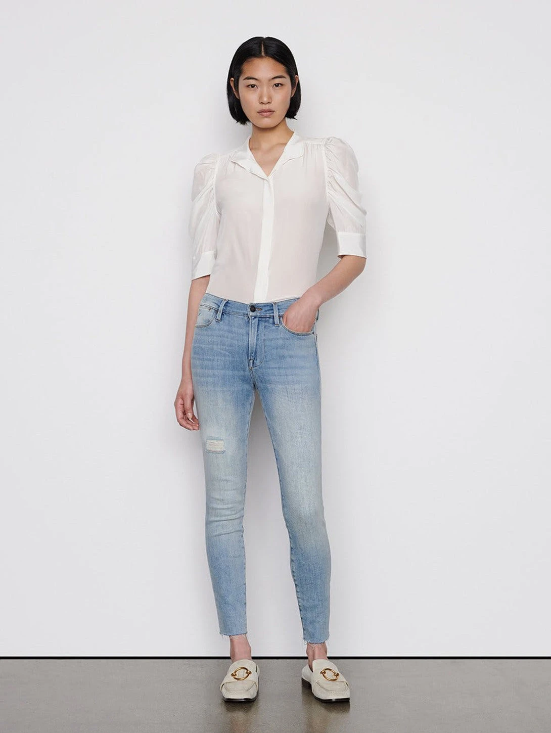 This delicate ramie blouse epitomizes modern femininity, featuring a high neckline and boldly puffed sleeves with ruched detailing. We love it tucked into cropped wide jeans with leather slides and a slim belt.Â