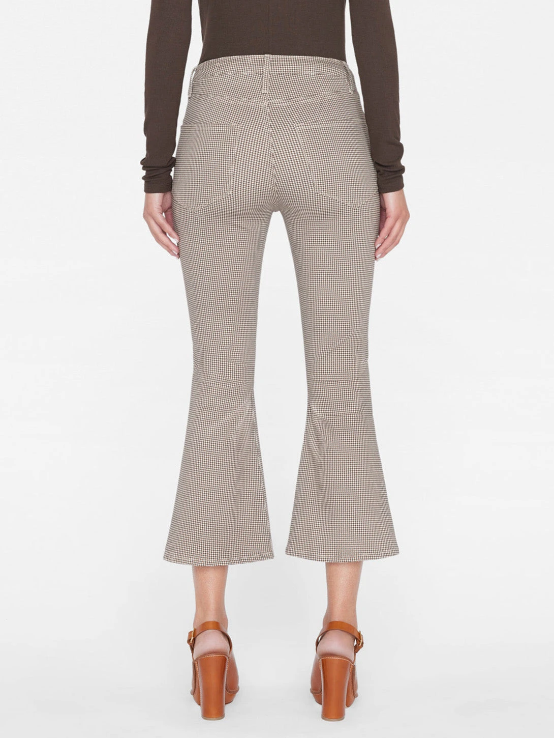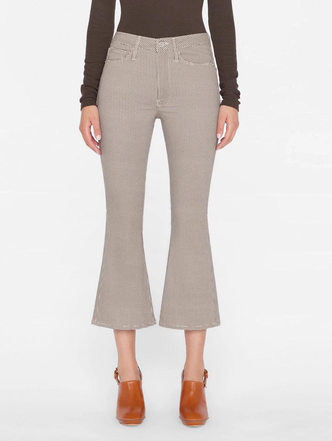 Micro houndstooth pants, designed with a high rise and swingy flared leg that hits just above the ankle. Crafted from a super stretch fabric that smooths and elevates.