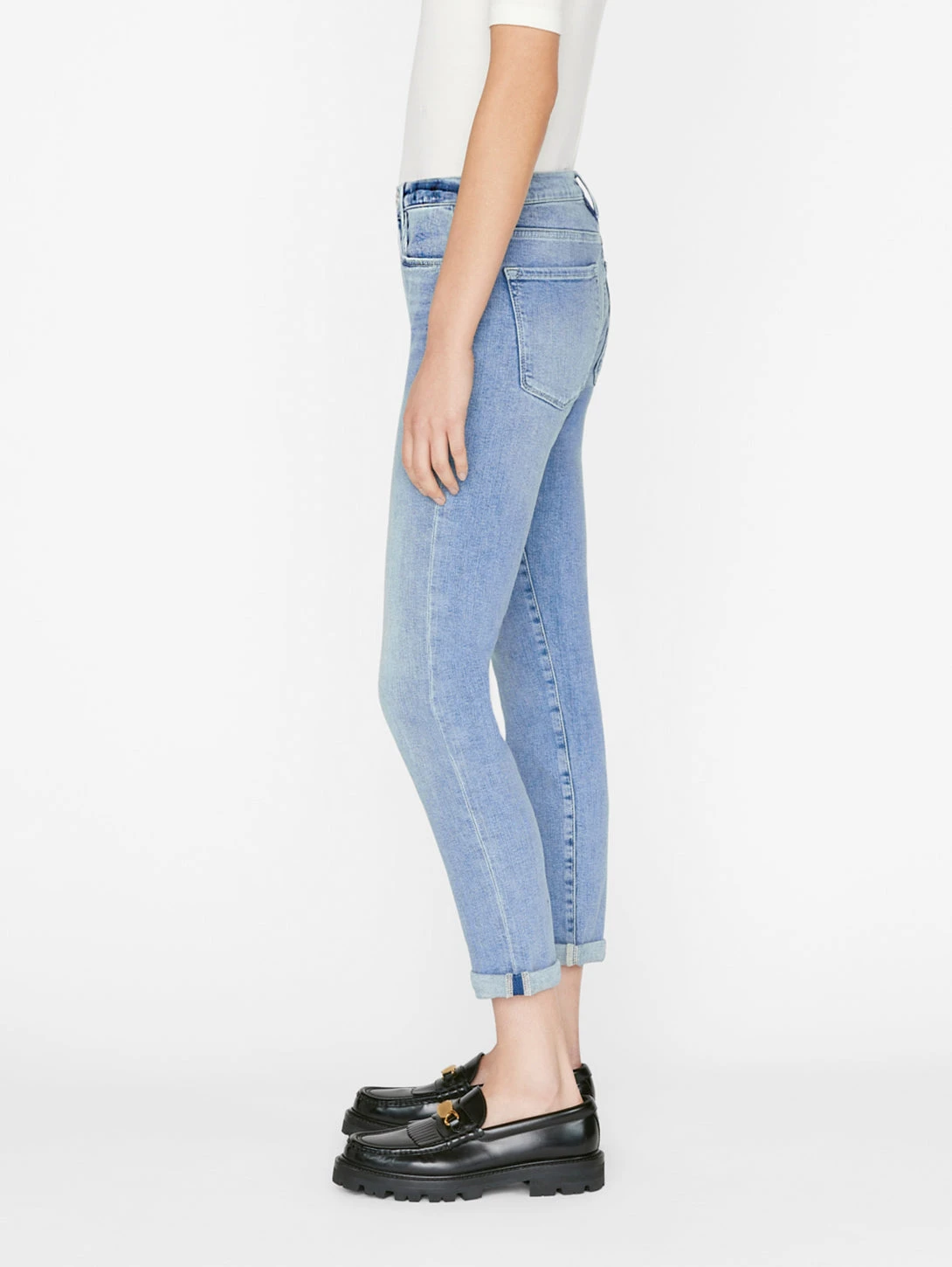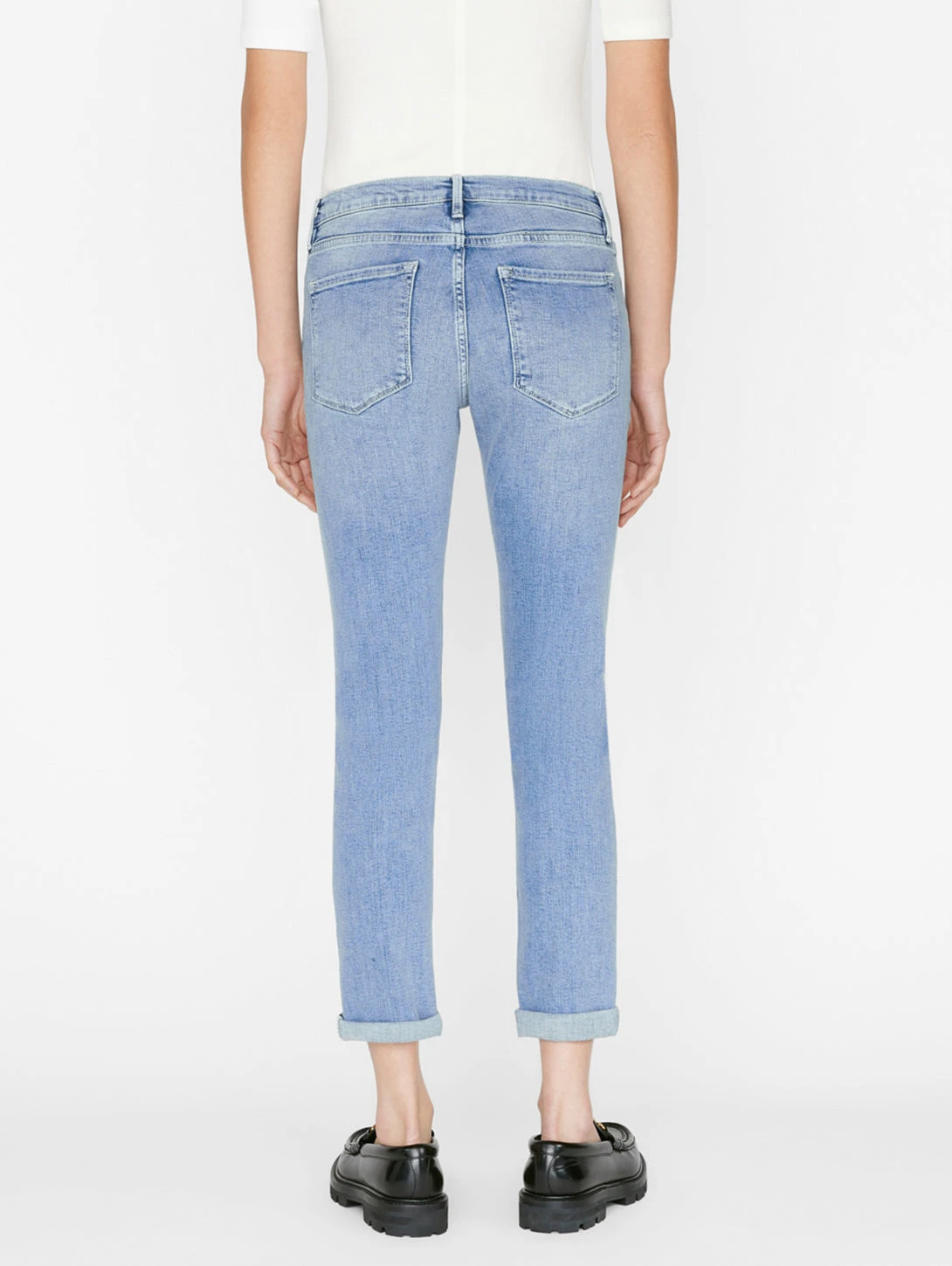 Galeston is a mid-rise skinny jean and a slouchier take on the classic boyfriend silhouette. The curved waist features a slightly higher rise in the back, for a comfortable hip-slung fit. This pair is crafted from super stretch denim in a light-blue wash and finished with a cuffed hem.