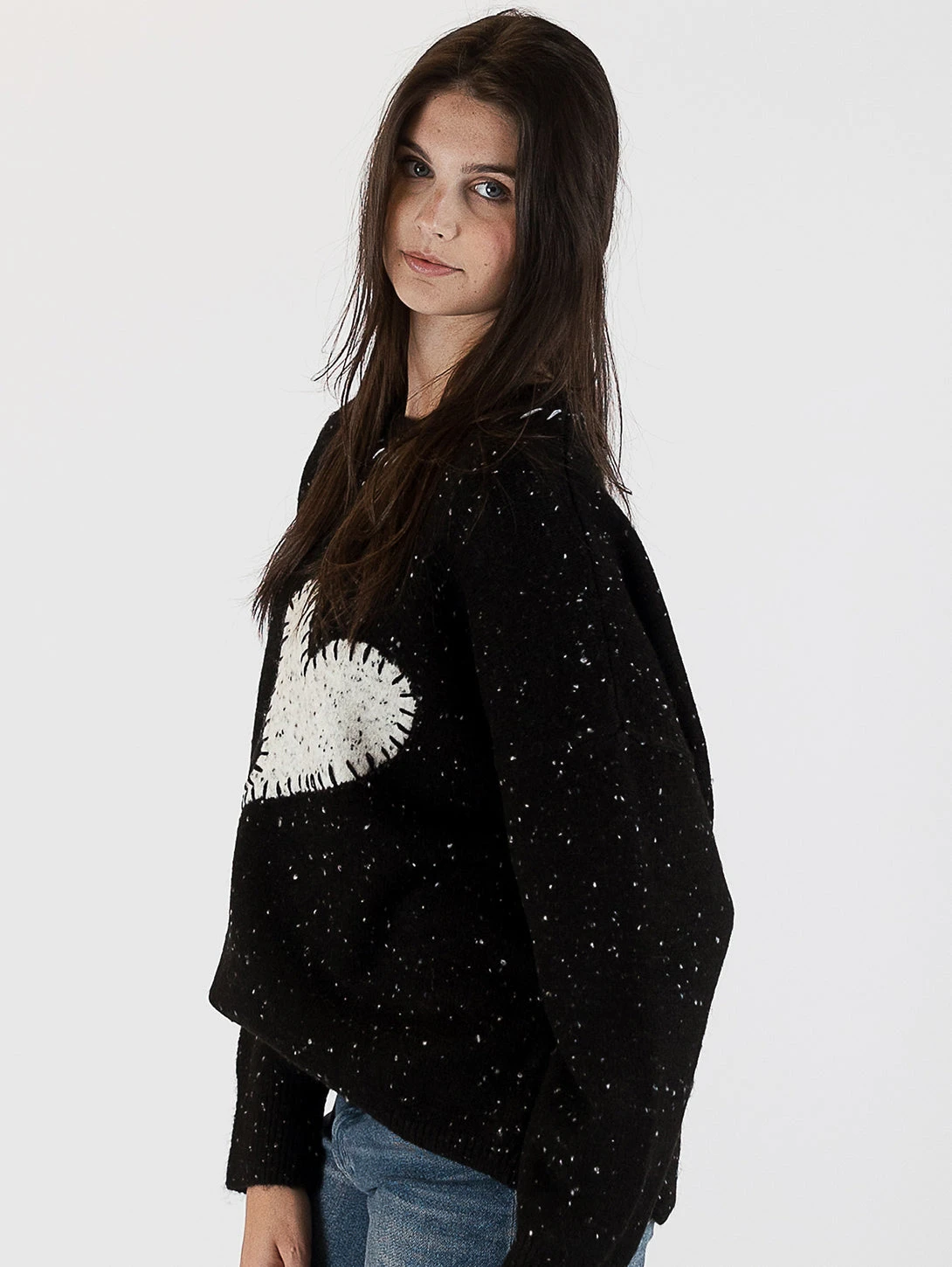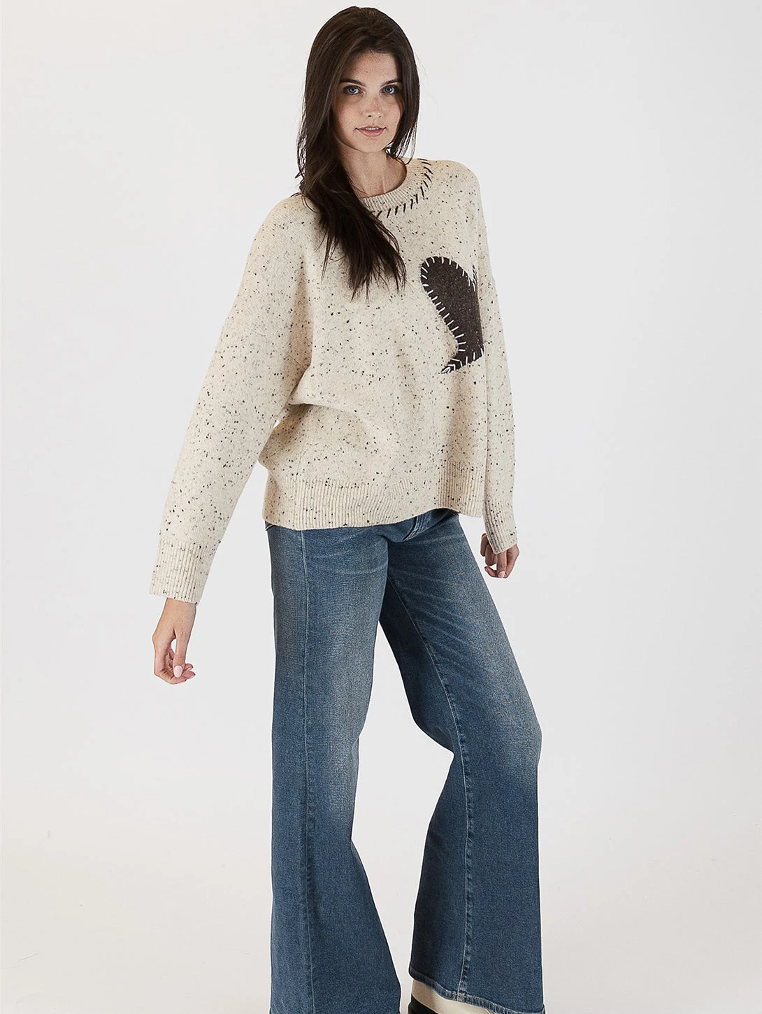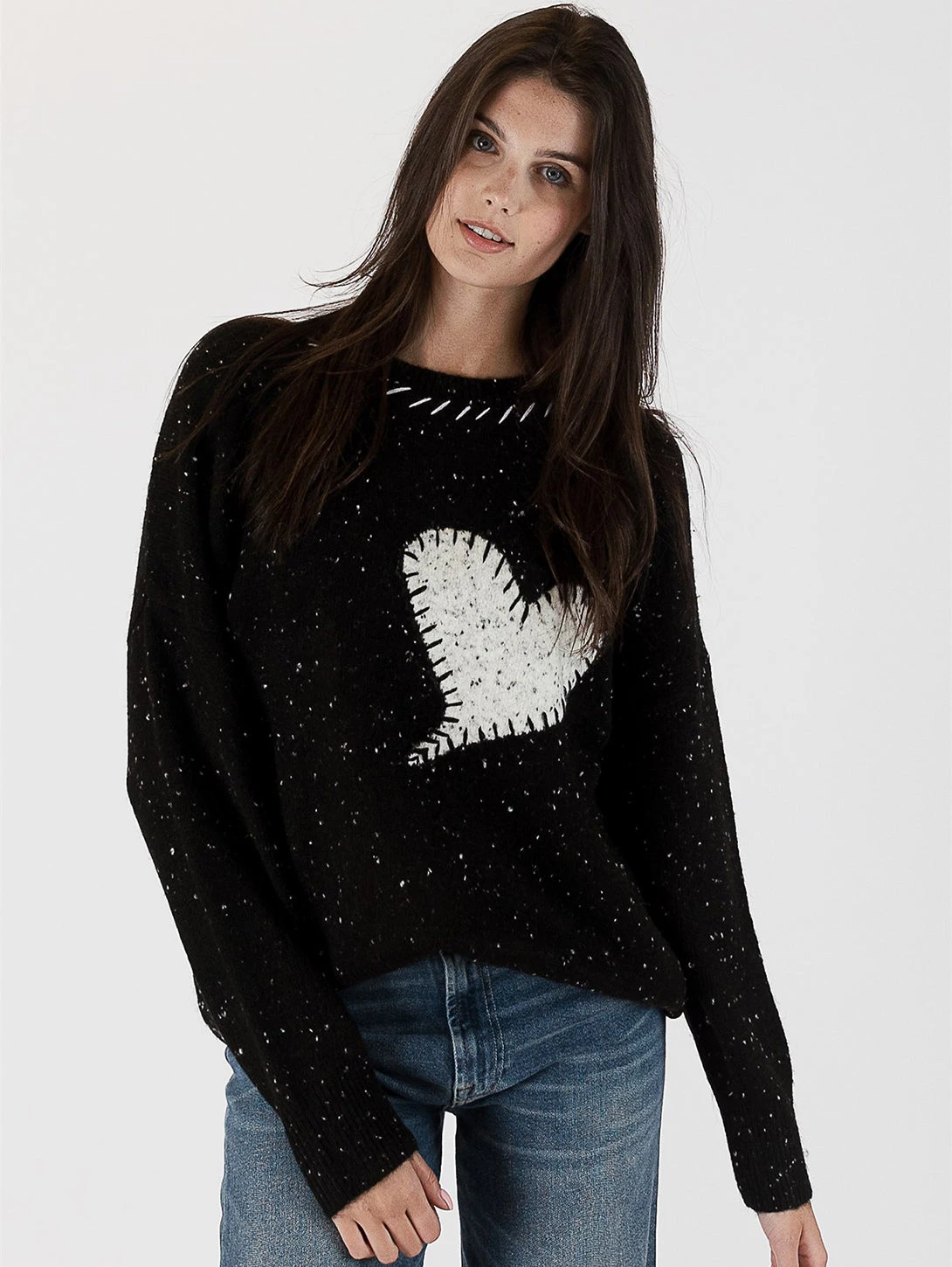 This sweater is a playful and stylish addition to your wardrobe. This sweater combines trendy flecked details with a large heart motif and top stitch accents, creating a unique and eye-catching design.