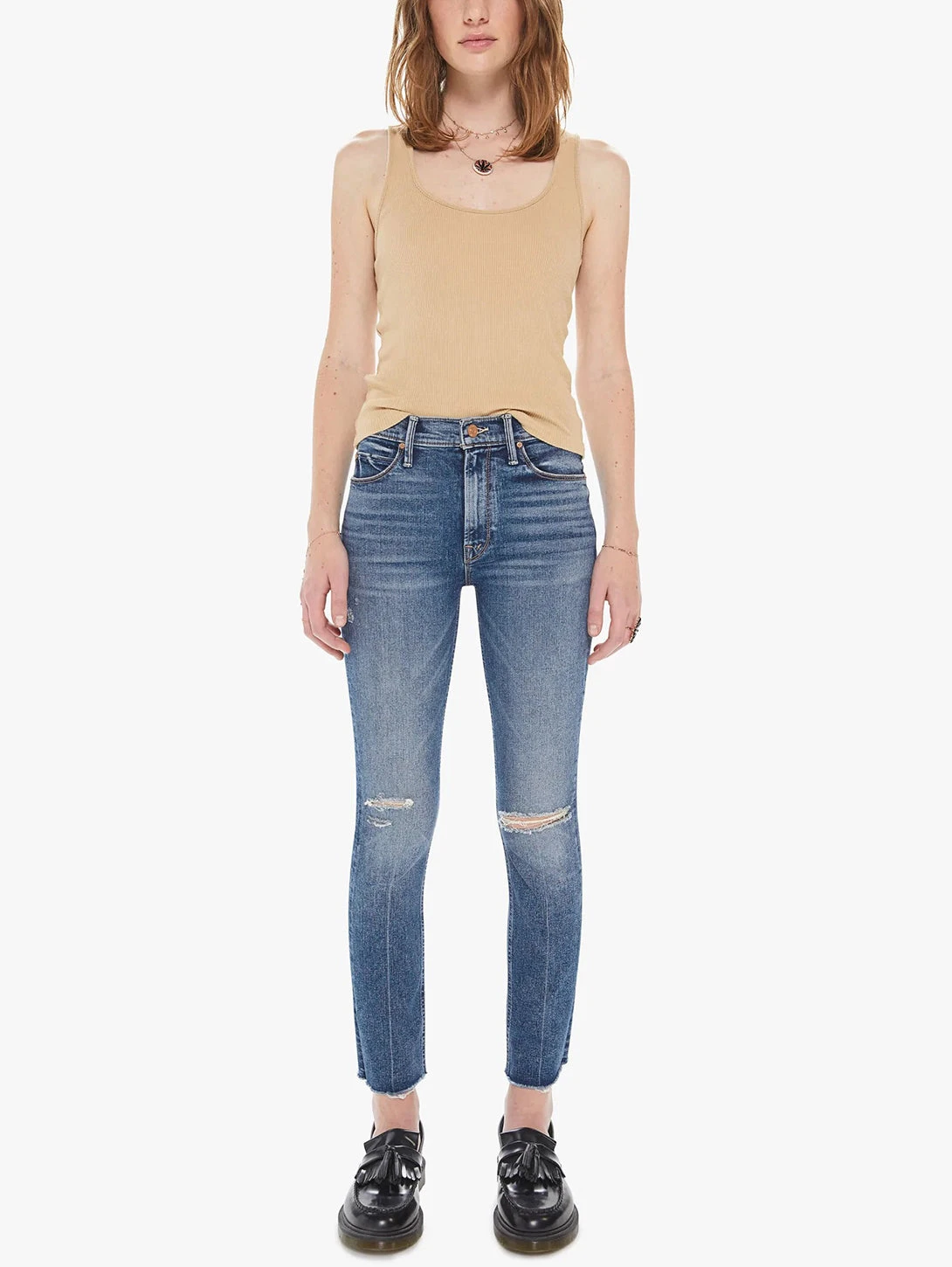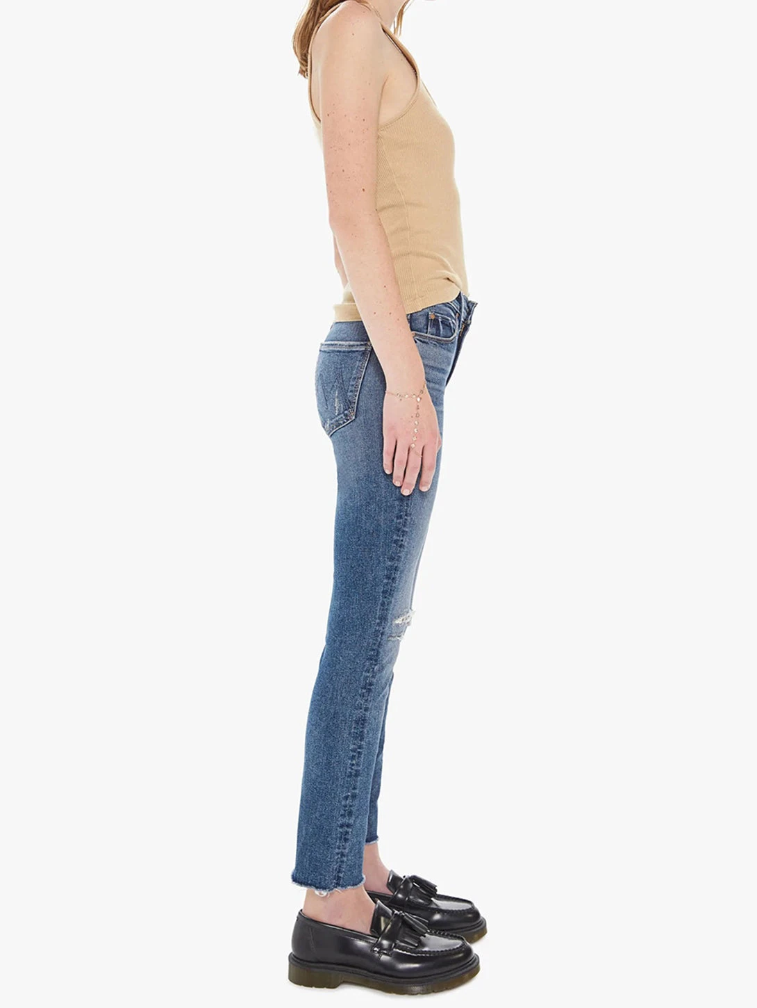 Spiraling. Our most popular mid-rise straight leg with an ankle-length inseam and a frayed hem. Cut from stretch denim, Going In Circles is a mid-blue wash with contrast whiskering, fading and tears at the knees.