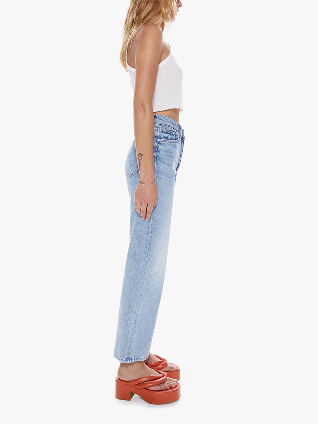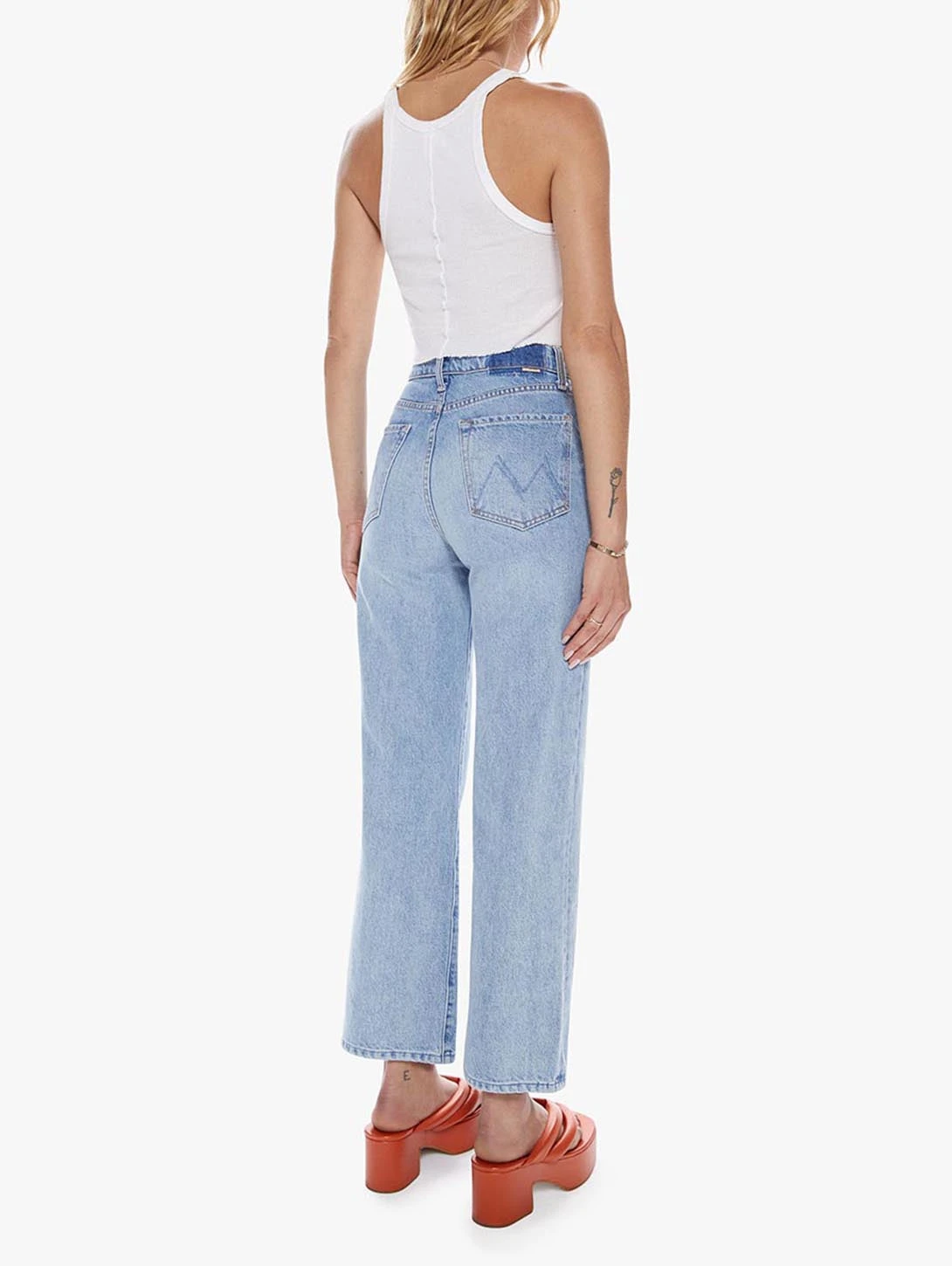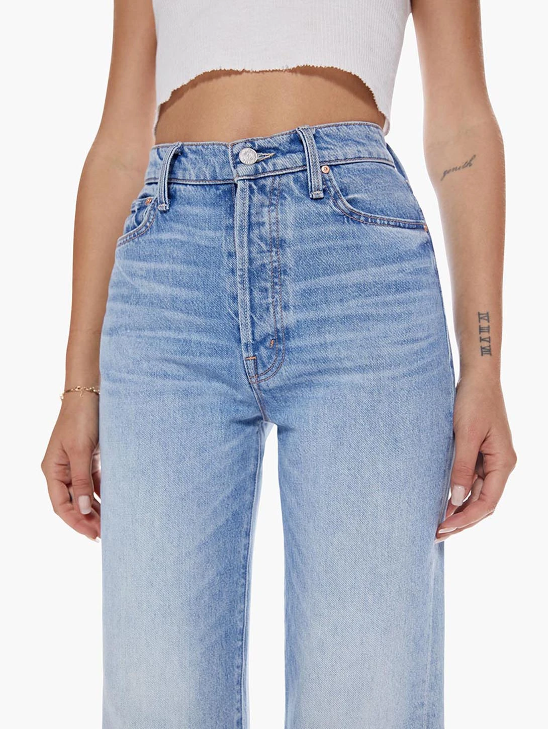 The Rambler Ankle is a high-waisted straight leg with a button fly and ankle-length inseam. Bucket List is a bright blue wash with subtle fading and whiskering throughout.