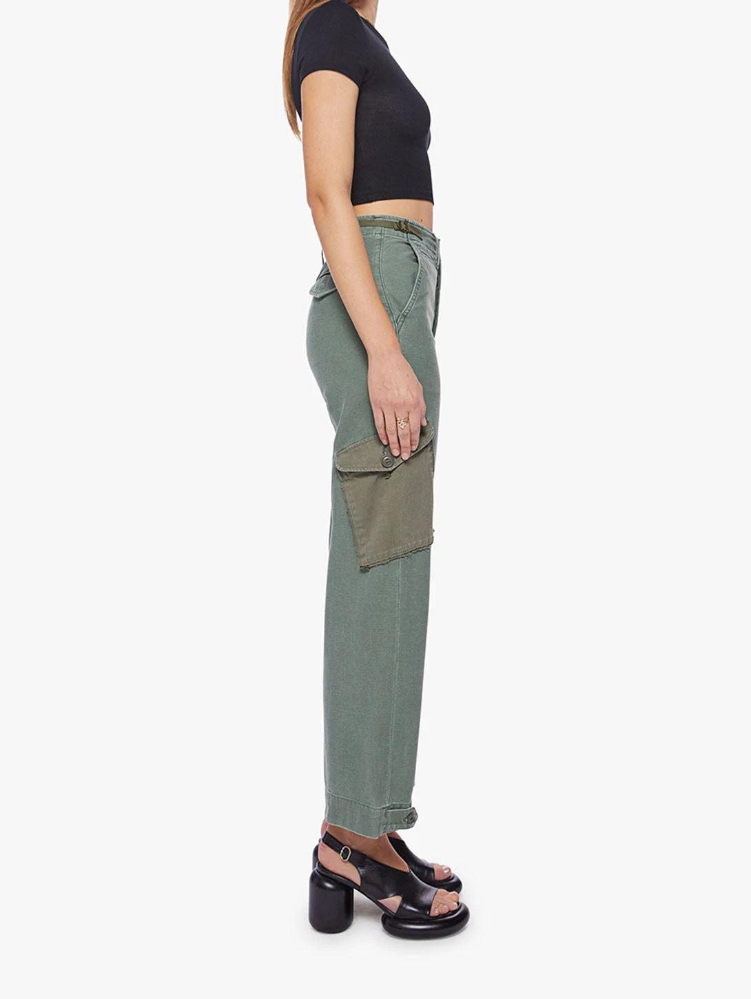 Roger that. Military-inspired cargo pants with a super high rise, patch pockets, a 30-inch inseam and buttons on the hem. Made from 100% cotton, On The Double is an army-green hue with pockets made from deadstock fabric.