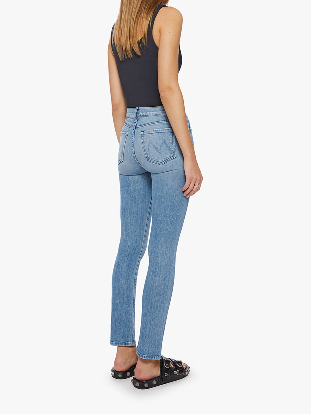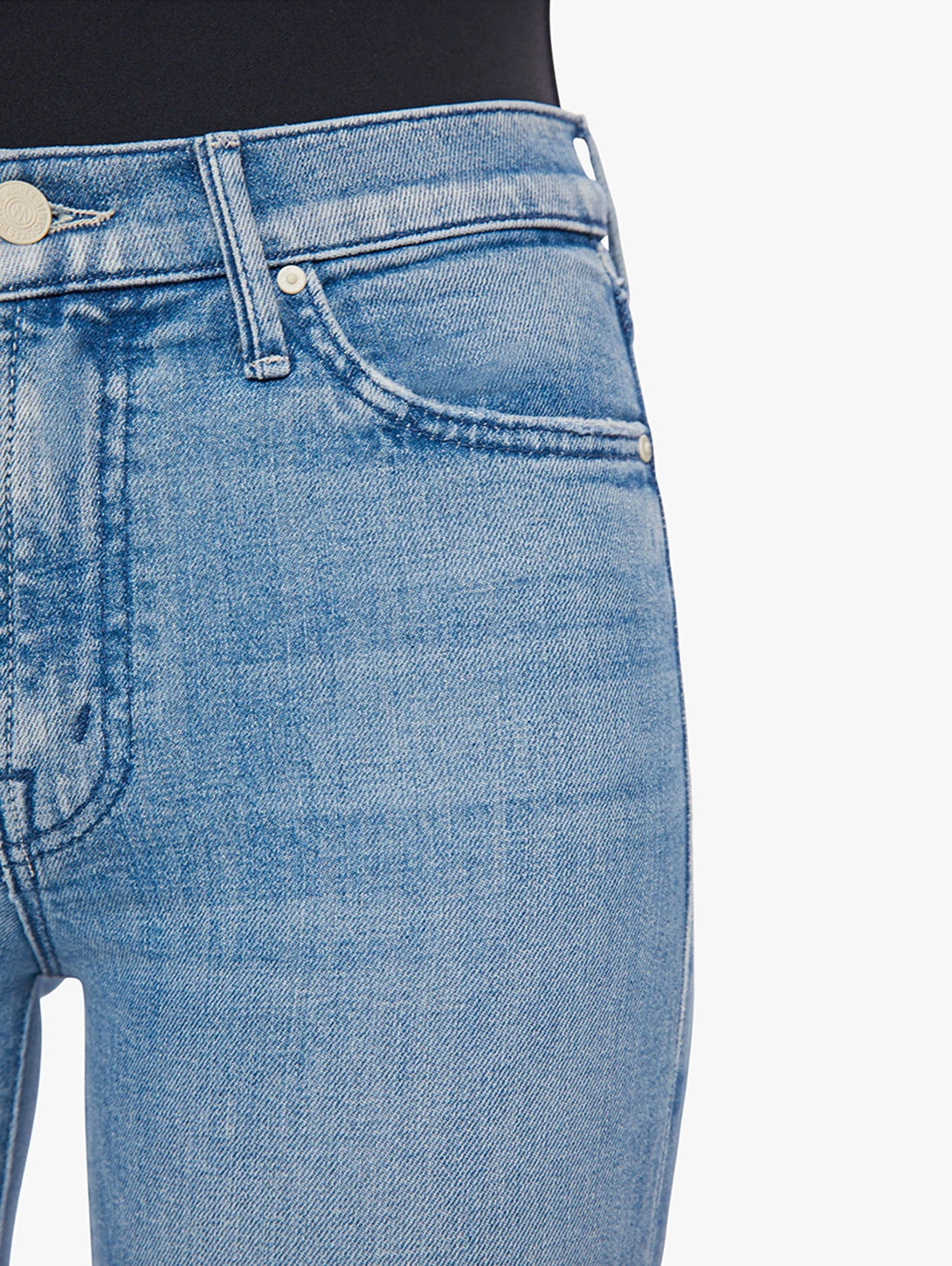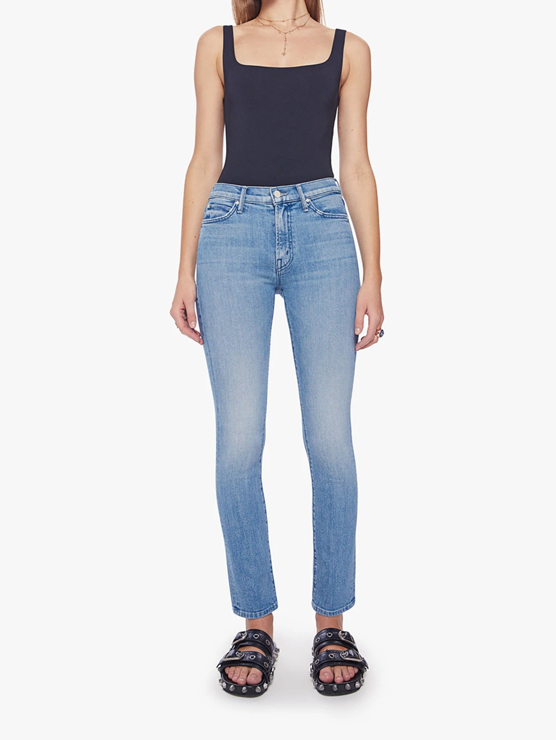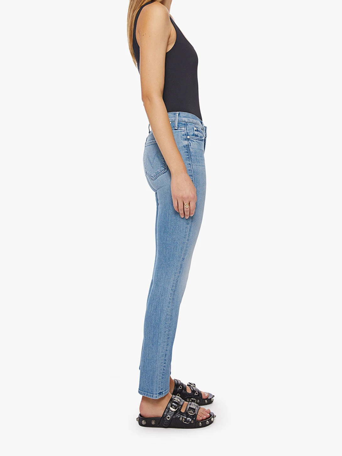Punk charming. A mid-rise straight leg with a 31-inch inseam and a clean hem. Cut from denim with a touch of stretch in a light blue wash with subtle whiskering and fading at the knees.