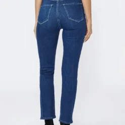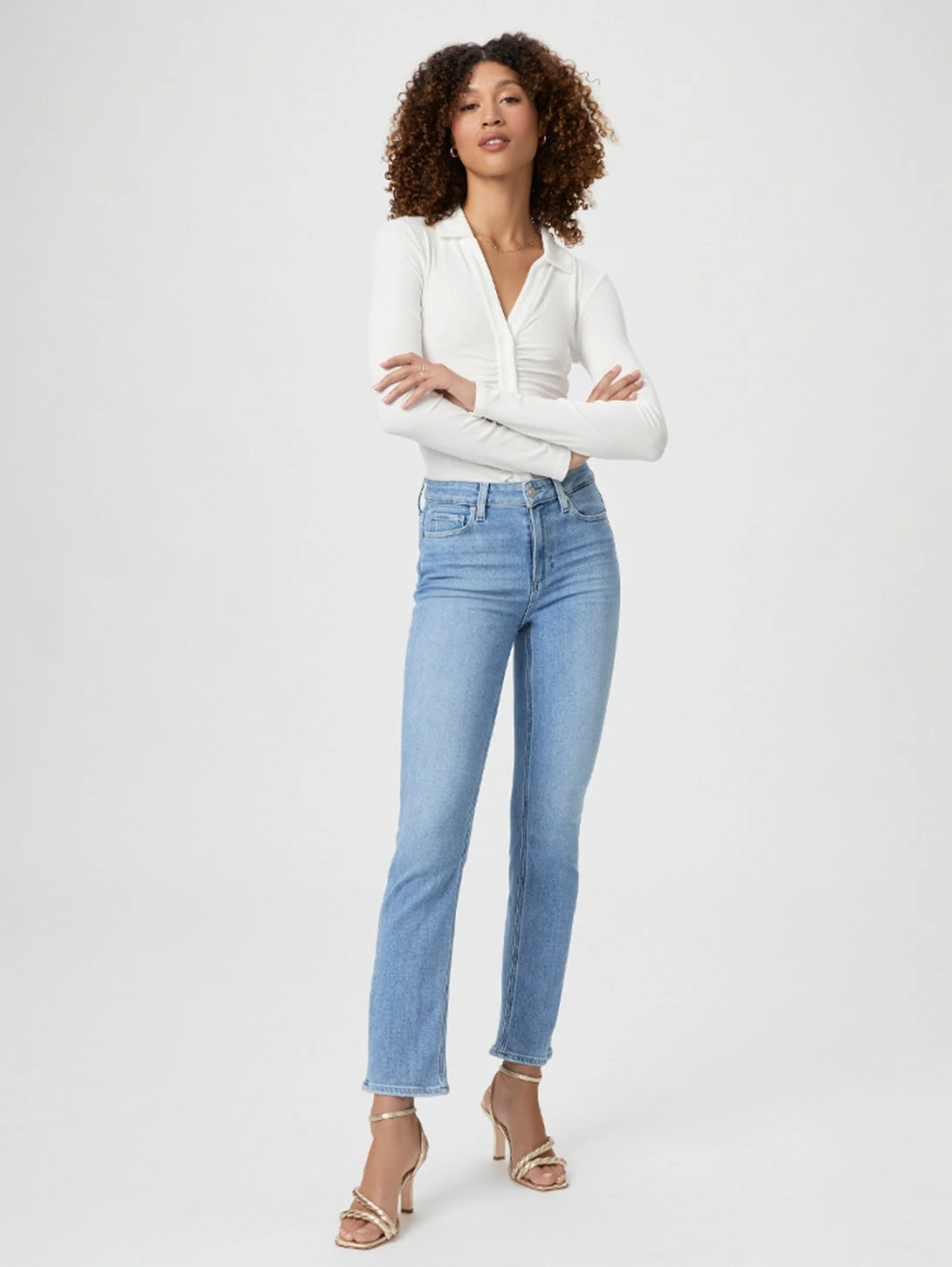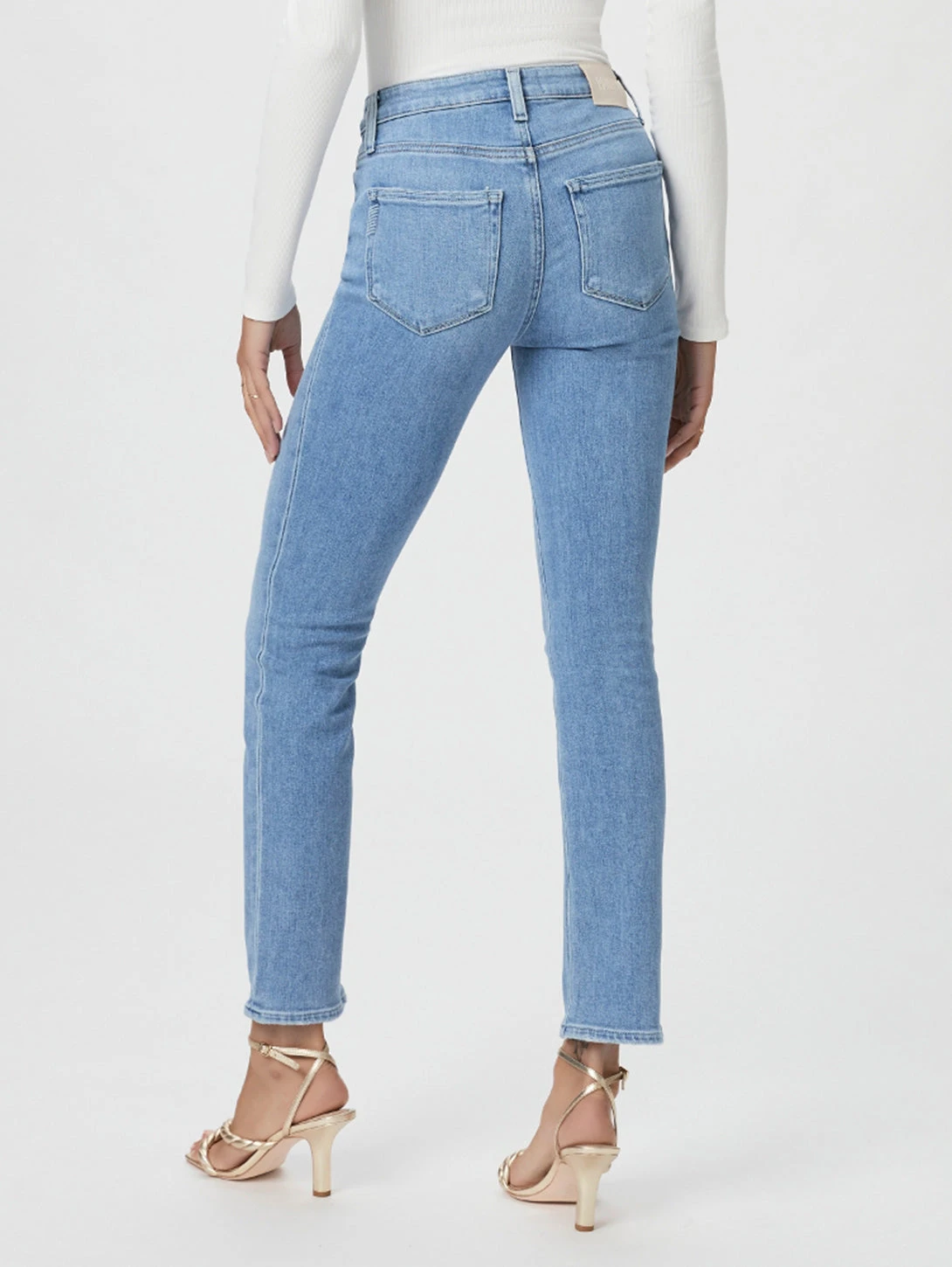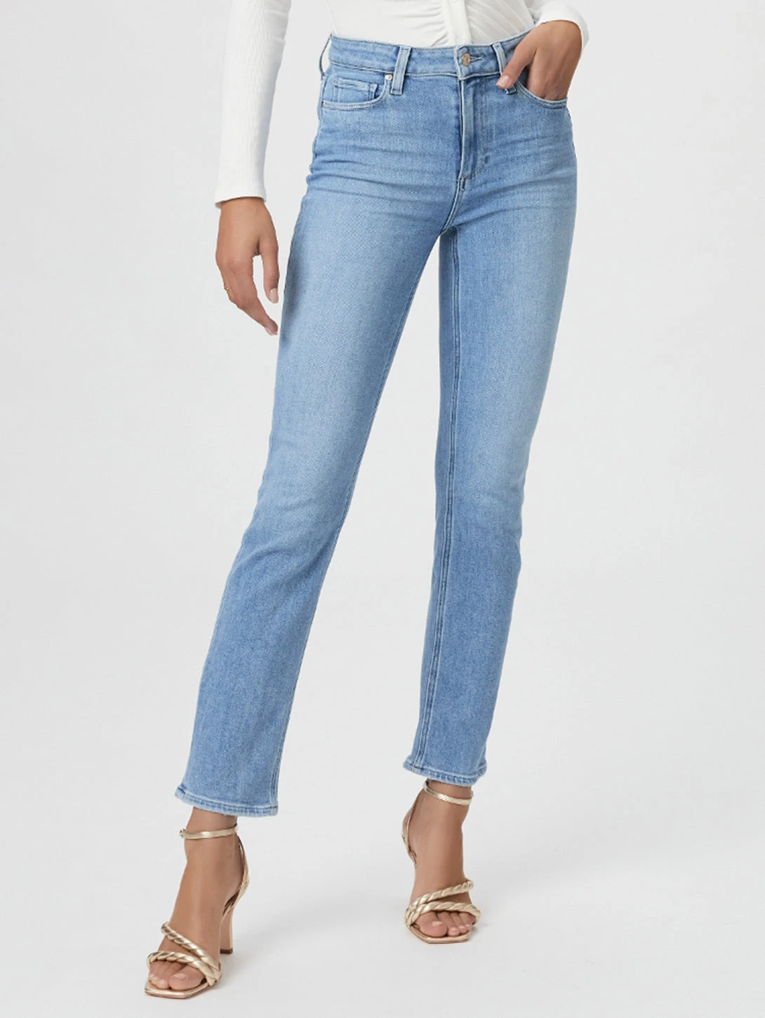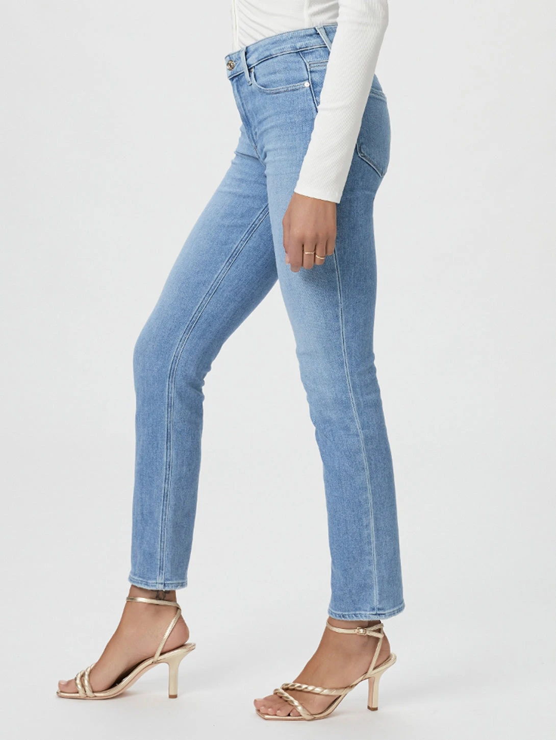 This high-rise, perfectly straight jean is lean through the leg and finishes at the ankle with a finished hem. This pair is cut from PAIGE Vintage denim in a perfectly lived-in light wash with whiskers and silver metalware. PAIGE combined the comfort of stretch with everything you love about authentic vintage denim to create super soft jeans that feel perfectly lived-in from the very first wear.
