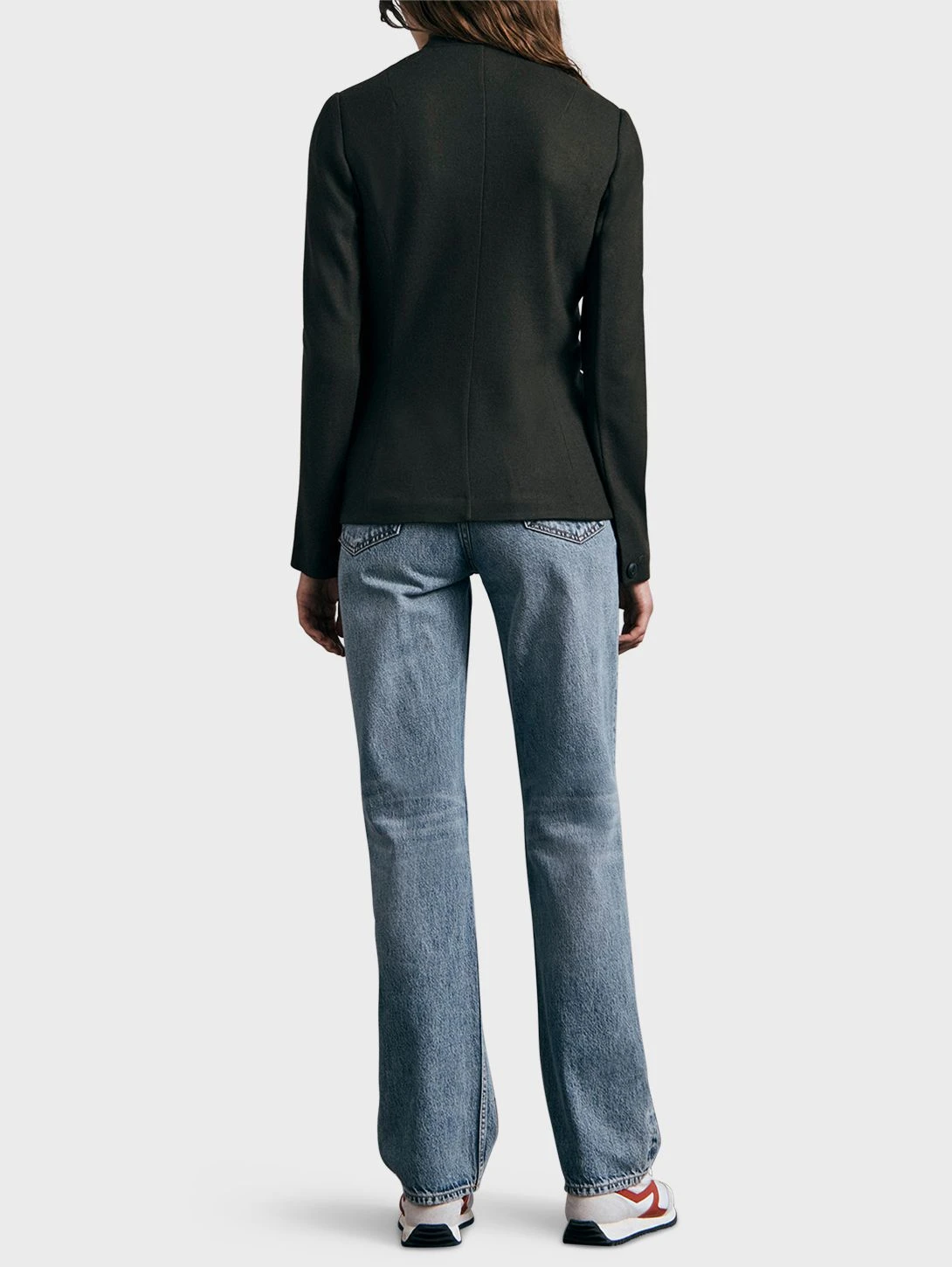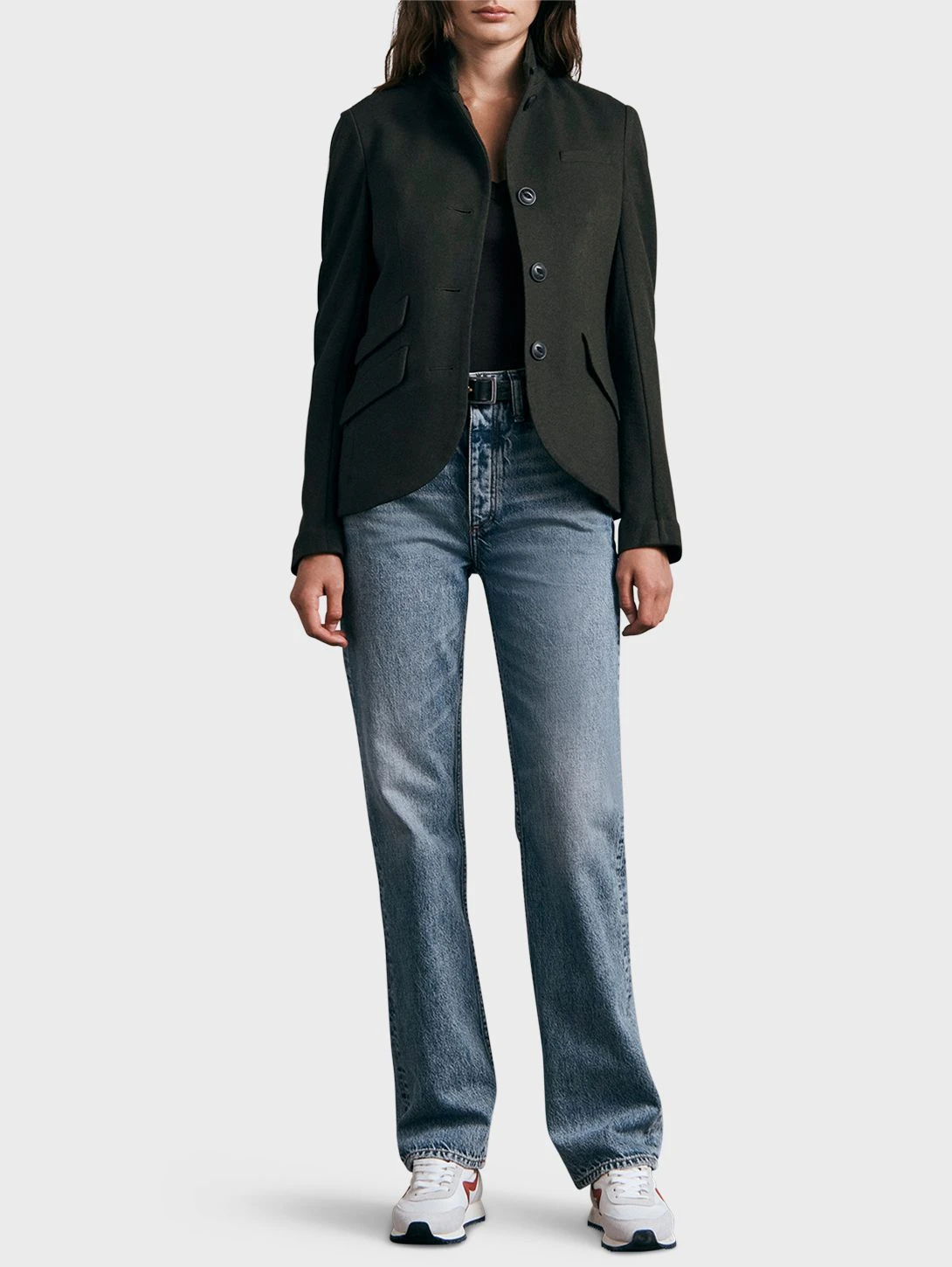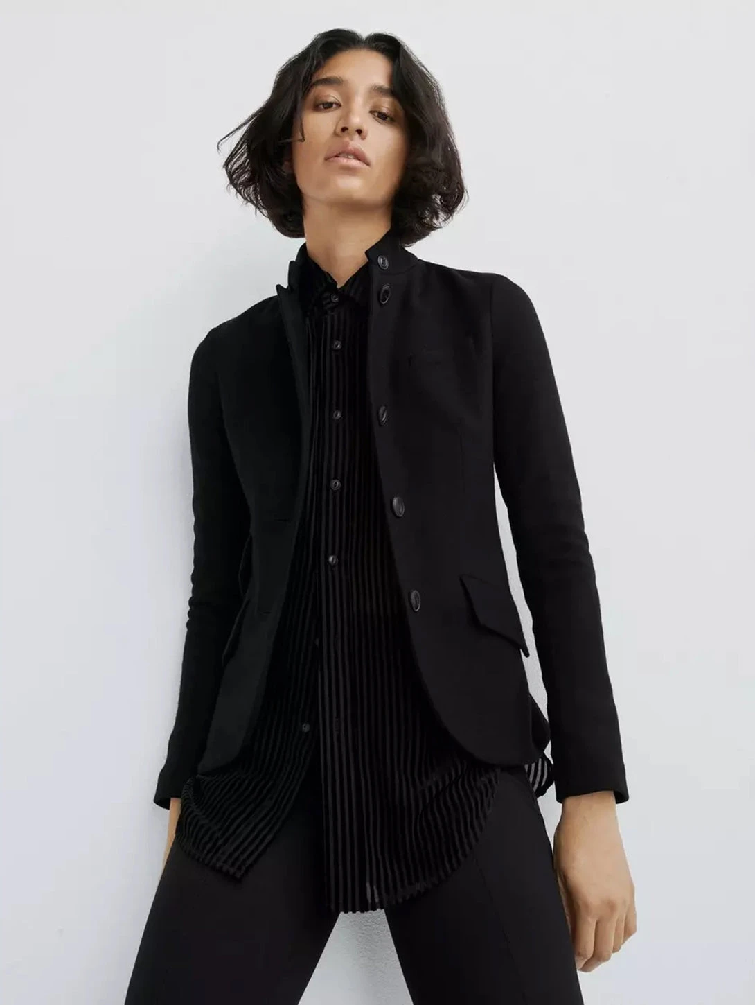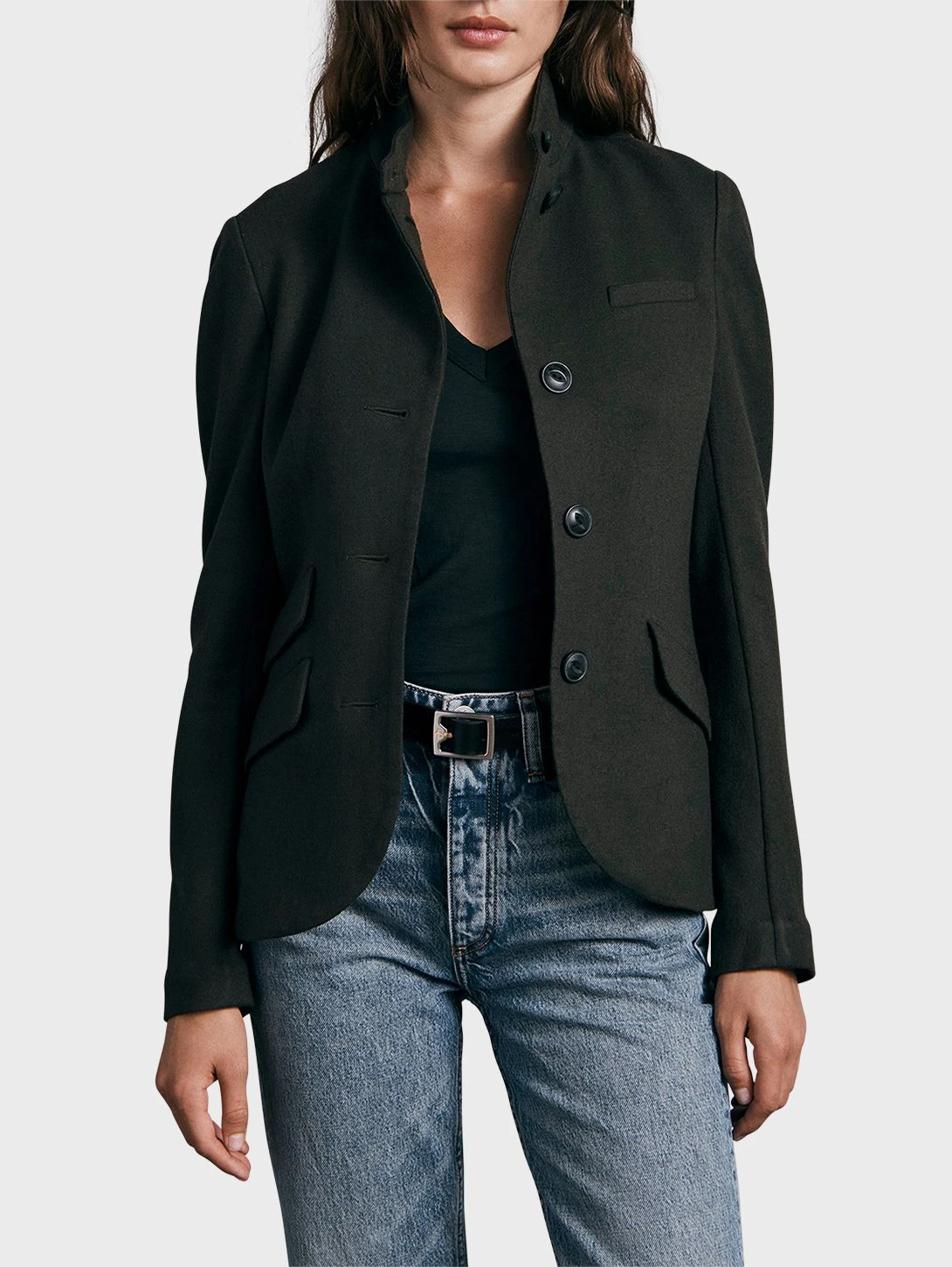 This Slade Wool Blazer is tailored for timeless sophistication. Crafted from luxurious wool suiting, it features a stand-up collar and a single-button center front closure. With its unlined construction and long sleeves, it’s a perfect blend of style and versatility.