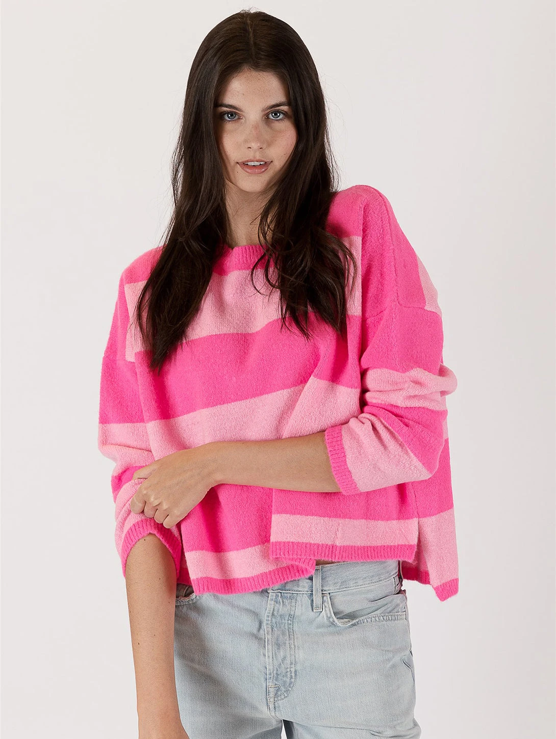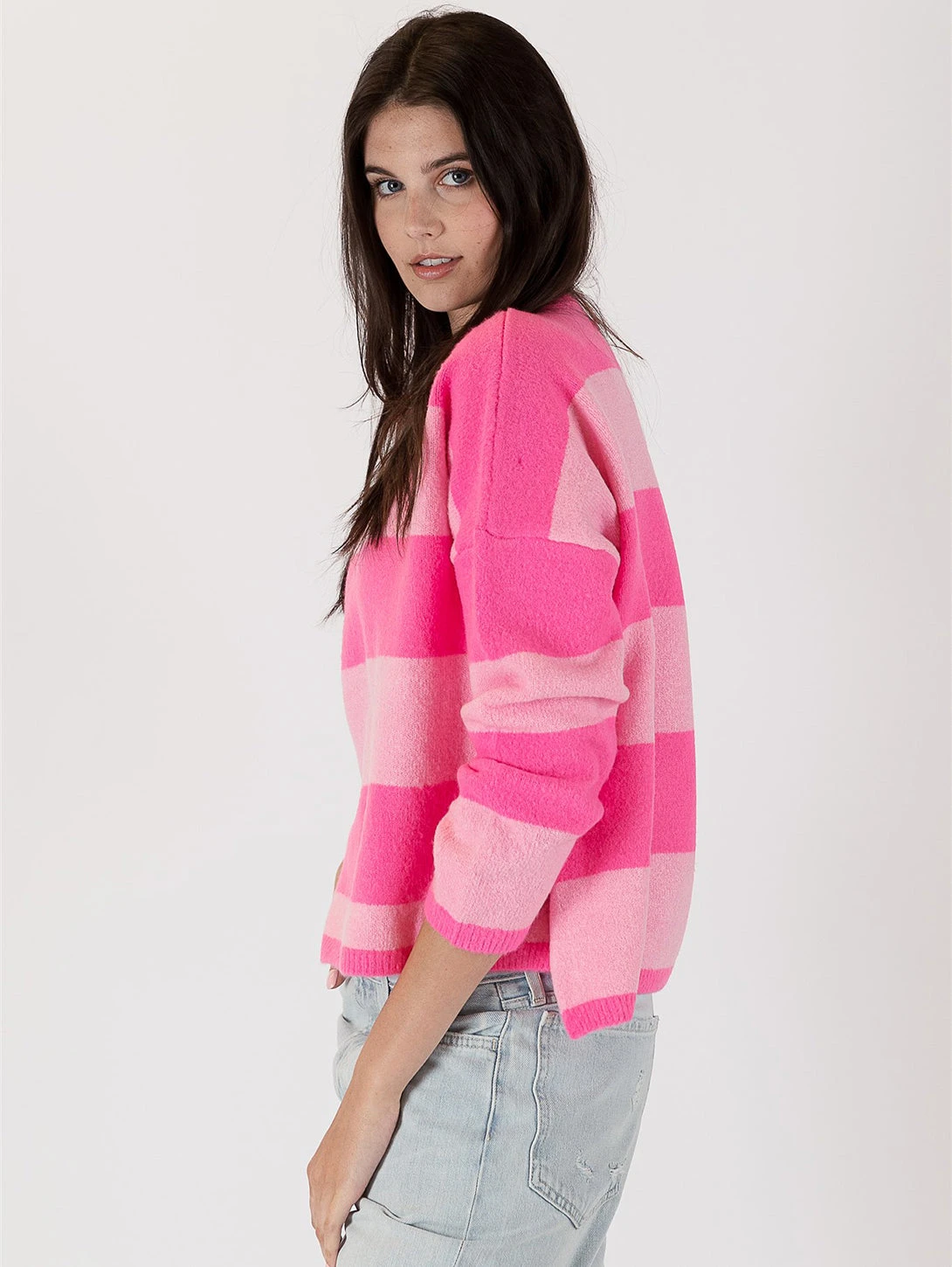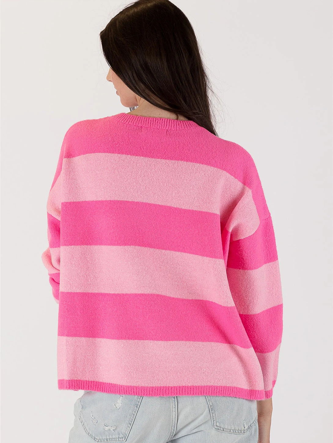 This sweater provides both comfort and warmth. The striped pattern adds a touch of visual interest, while the monochromatic color palette creates a sleek and polished look.Â