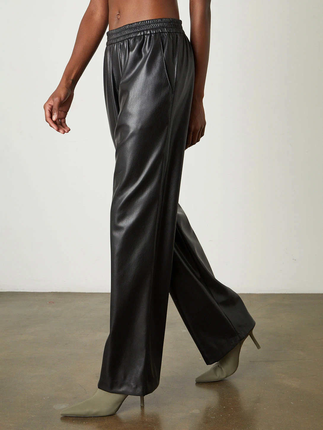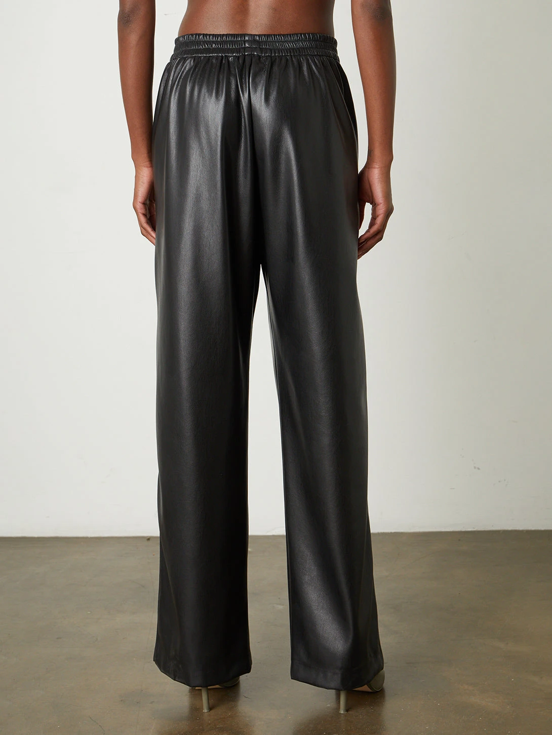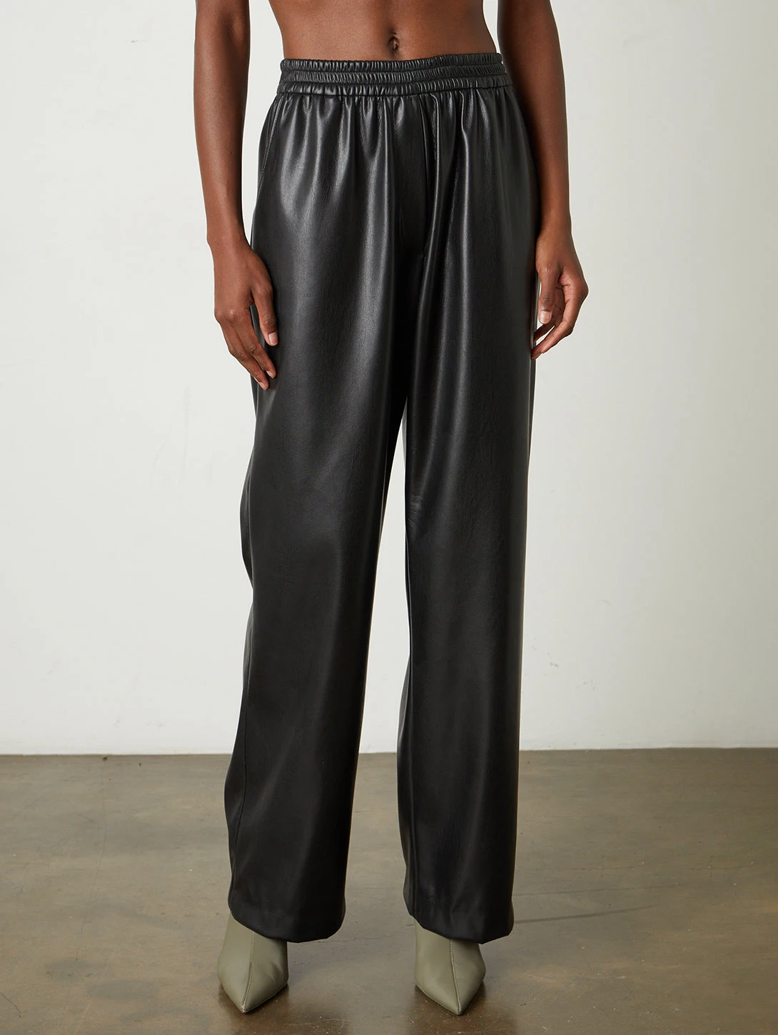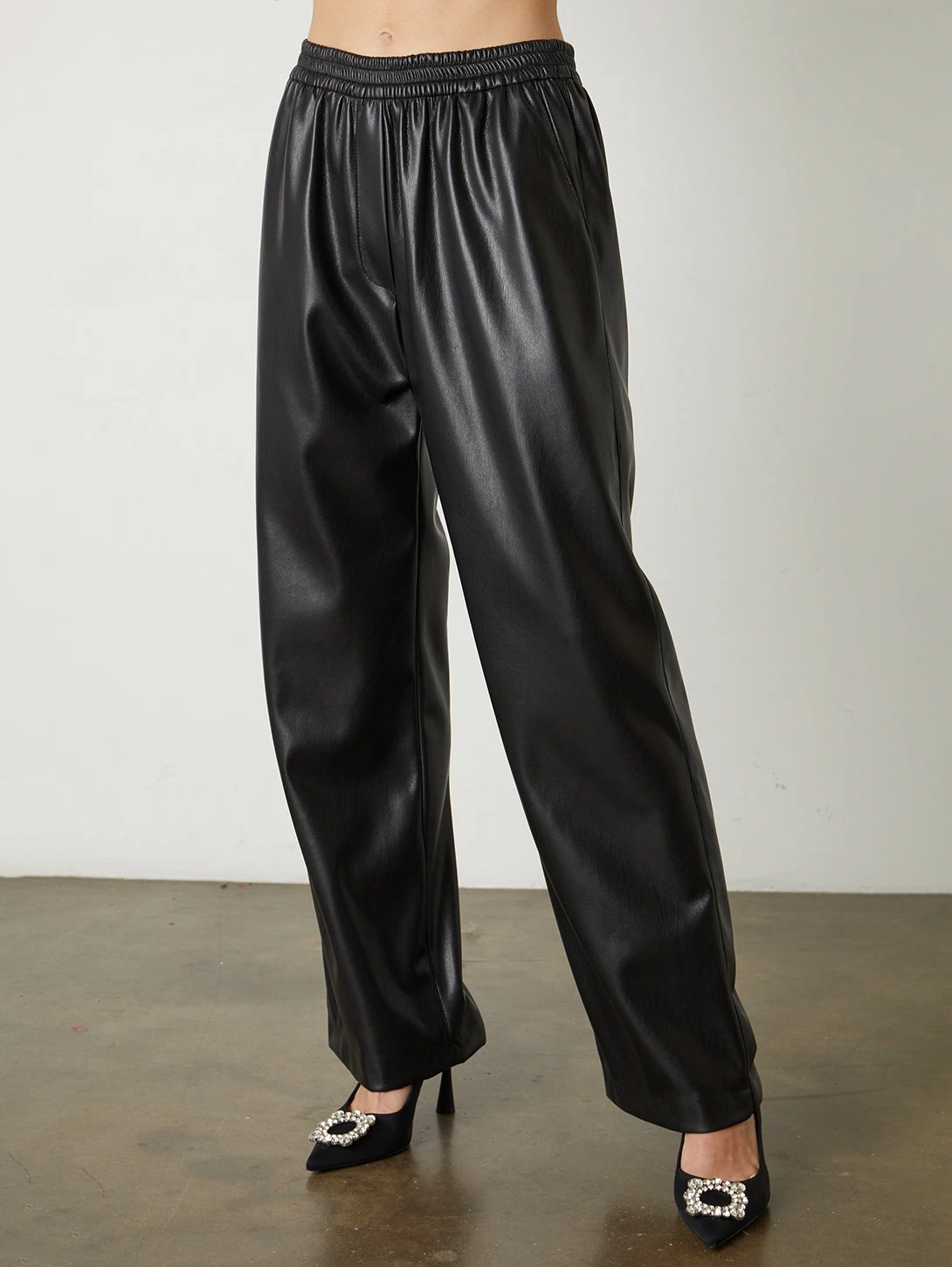 Jenna pant is crafted from super stretch faux leather, featuring an elastic waist, and slanted pockets and are designed for a loose fit. Perfect for those errand days.