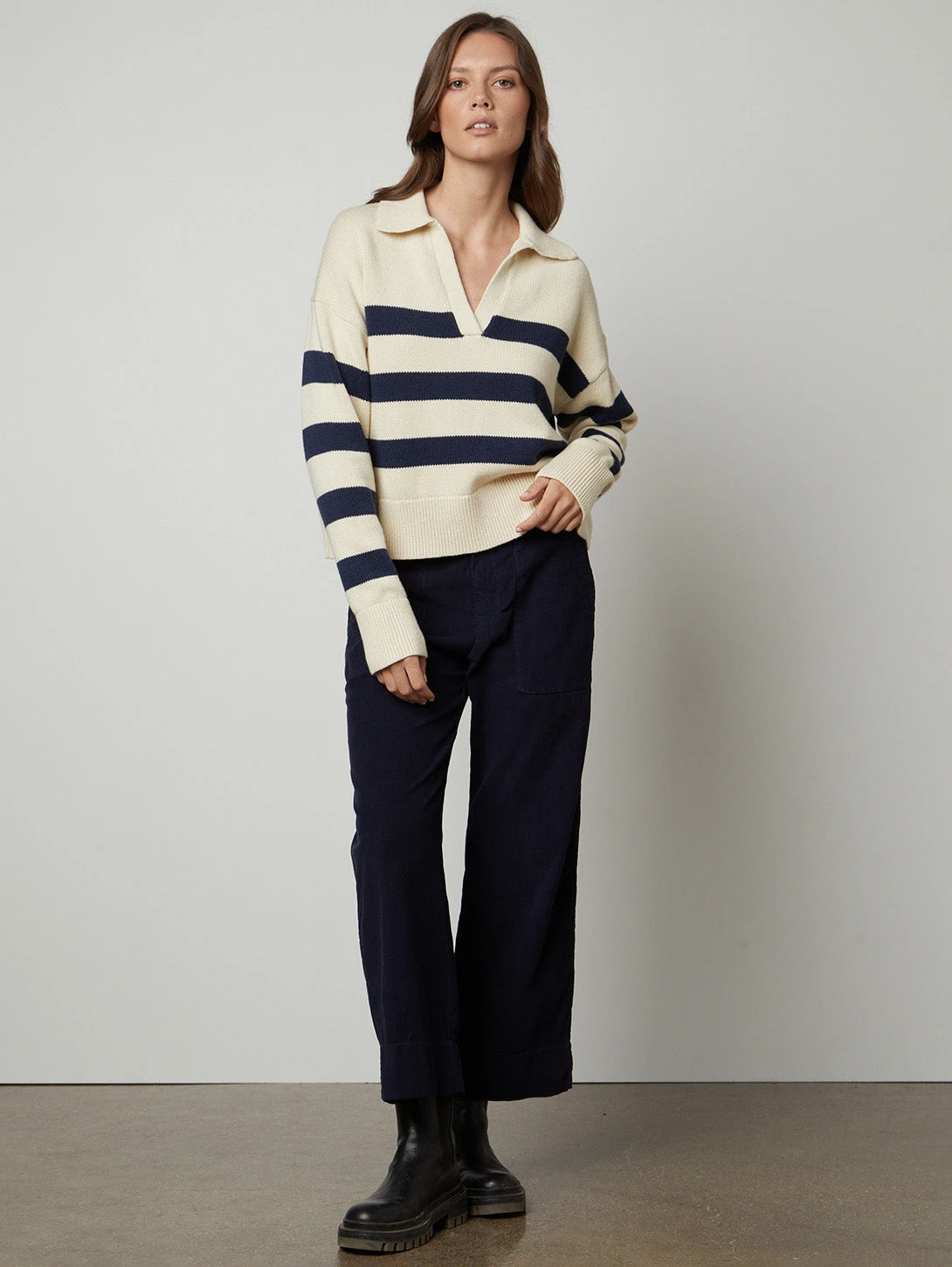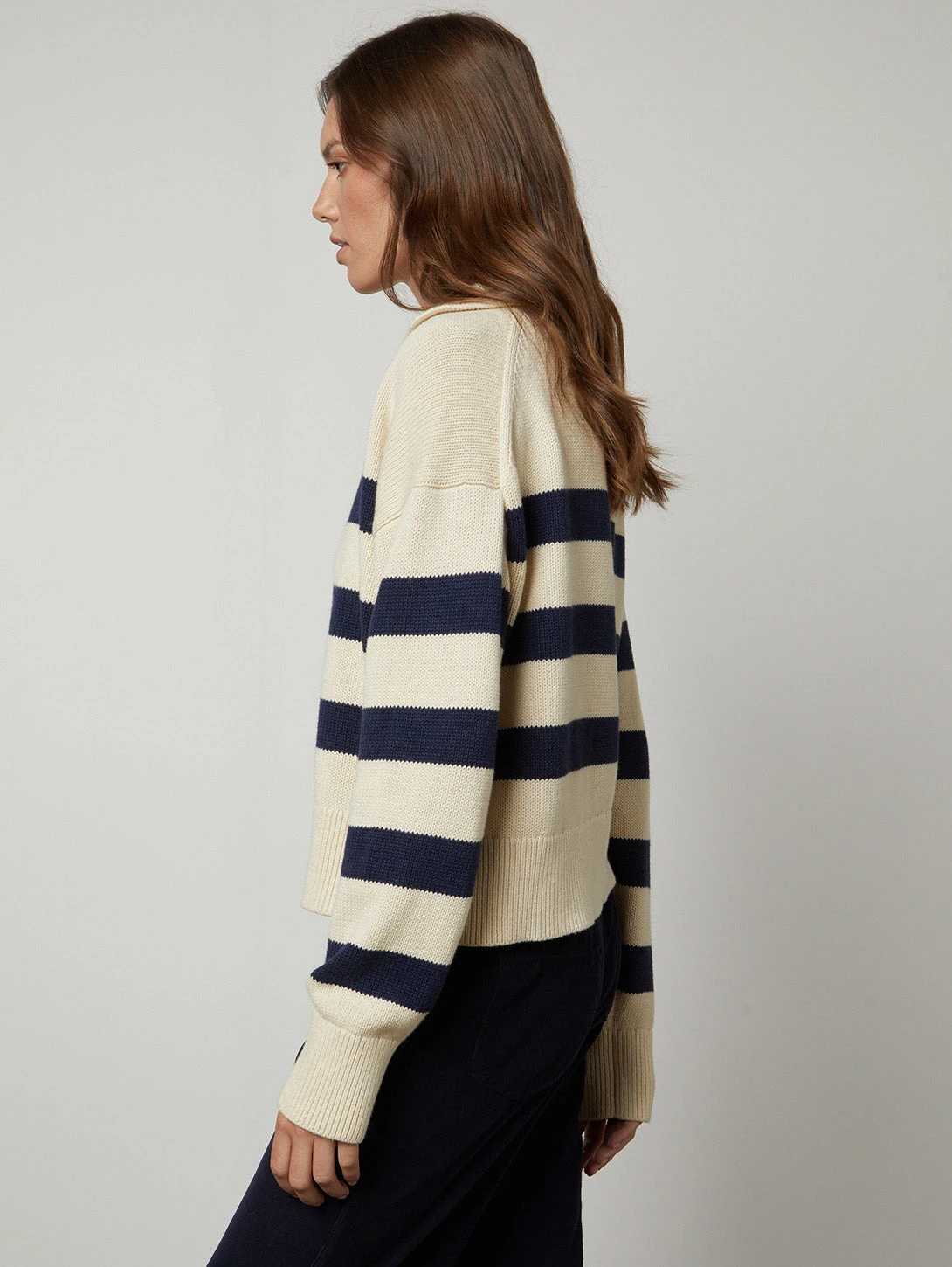 A perfect sweater for those in-between days in on-point stripes. Crafted from a luxe and lightweight cotton/cashmere blend and with a ribbed V-neckline and soft collar. Great layered or solo.