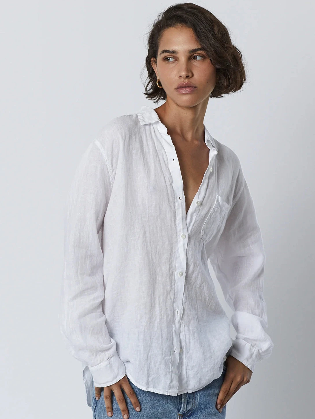 Considered one of the ultimate essentials, this linen button-up has a slightly relaxed silhouette that lends added ease to the styling. The scooped hemline looks equally chic tucked or left loose.